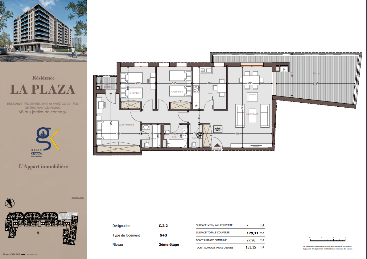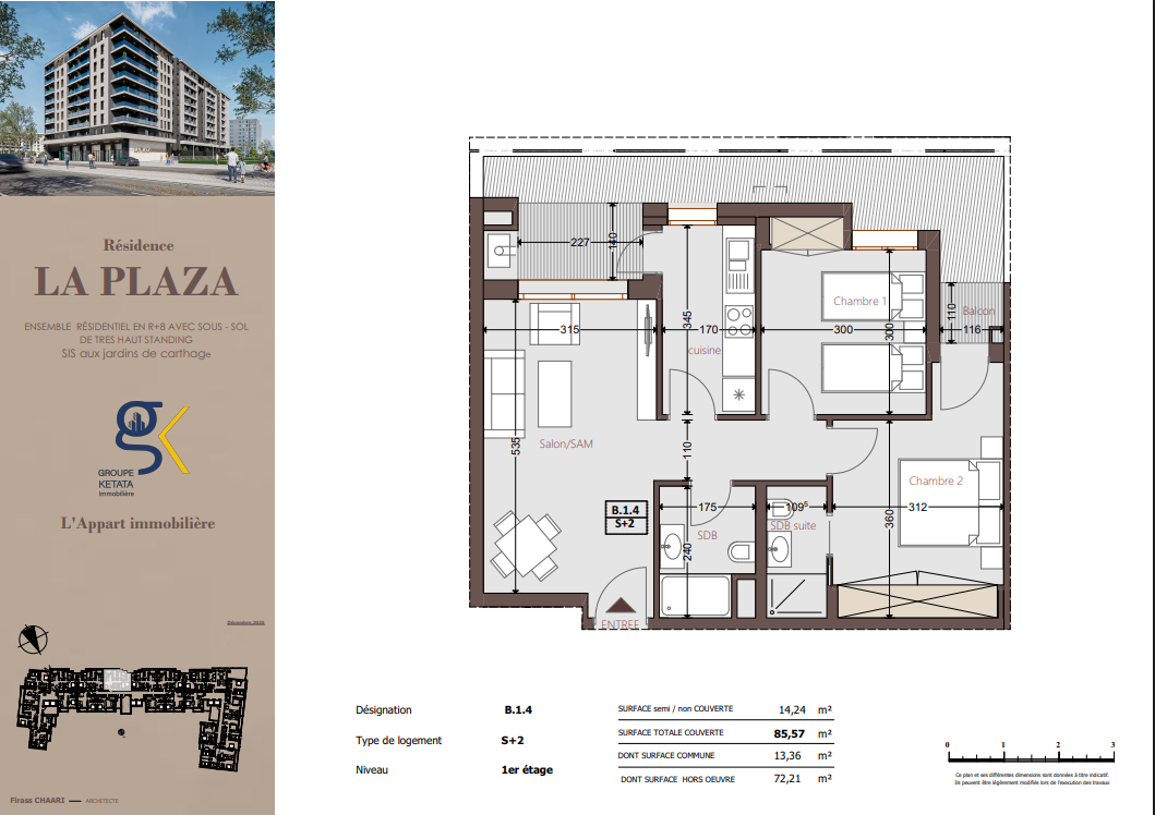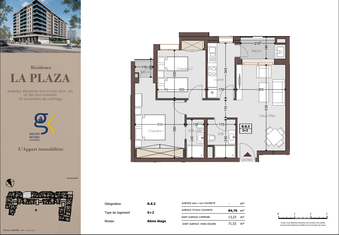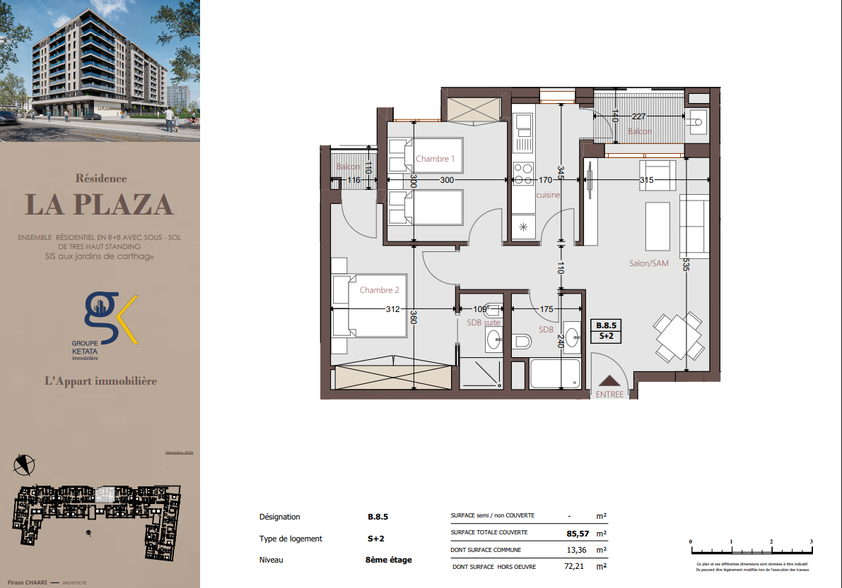 Idéalement située au cœur des Jardins de Carthage, La Plazza incarne une nouvelle vision de la résidence haut standing. Signée par Groupe Ketata Immobilier, elle offre un cadre de vie alliant confort absolu, élégance contemporaine et sérénité, au sein d’un quartier prisé et parfaitement connecté à toutes les commodités essentielles. Son architecture moderne reflète un subtil équilibre entre prestige et design actuel.