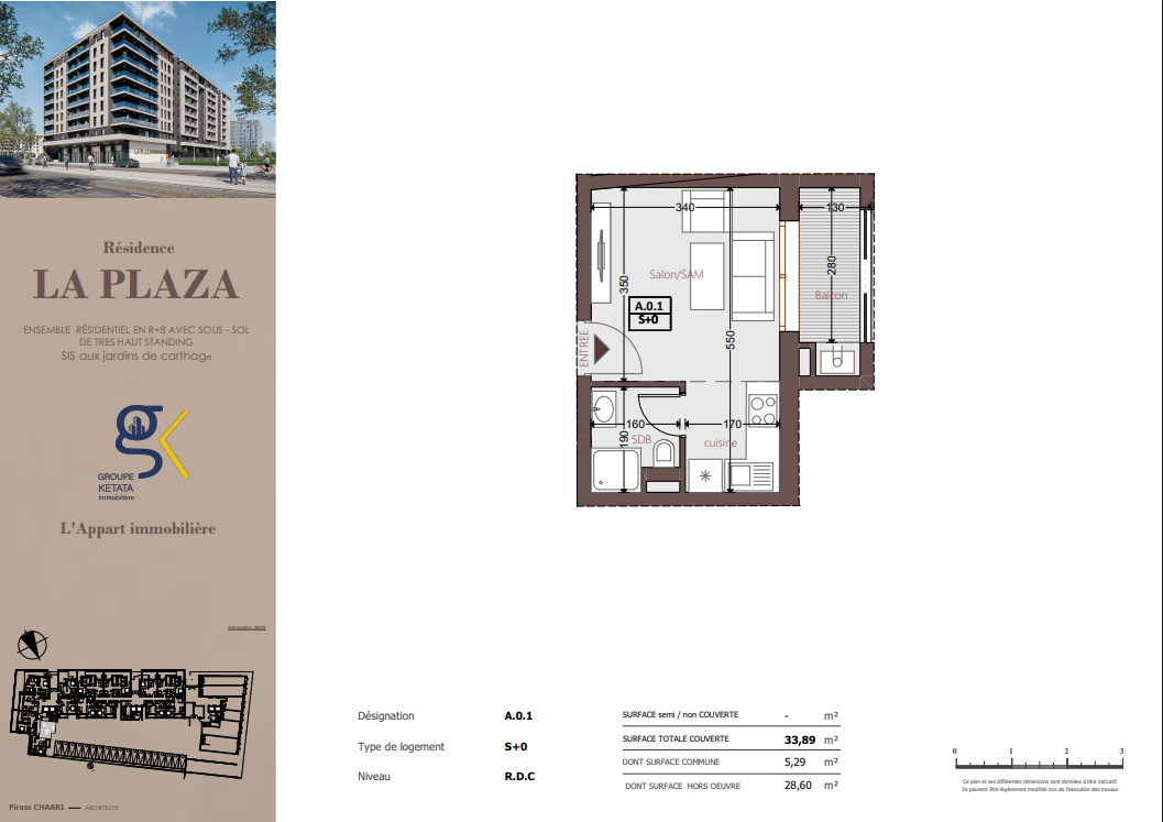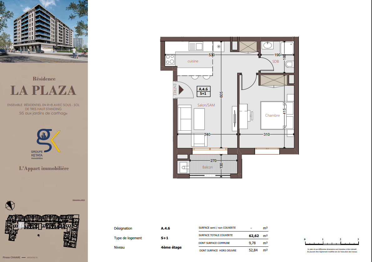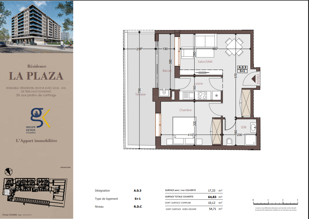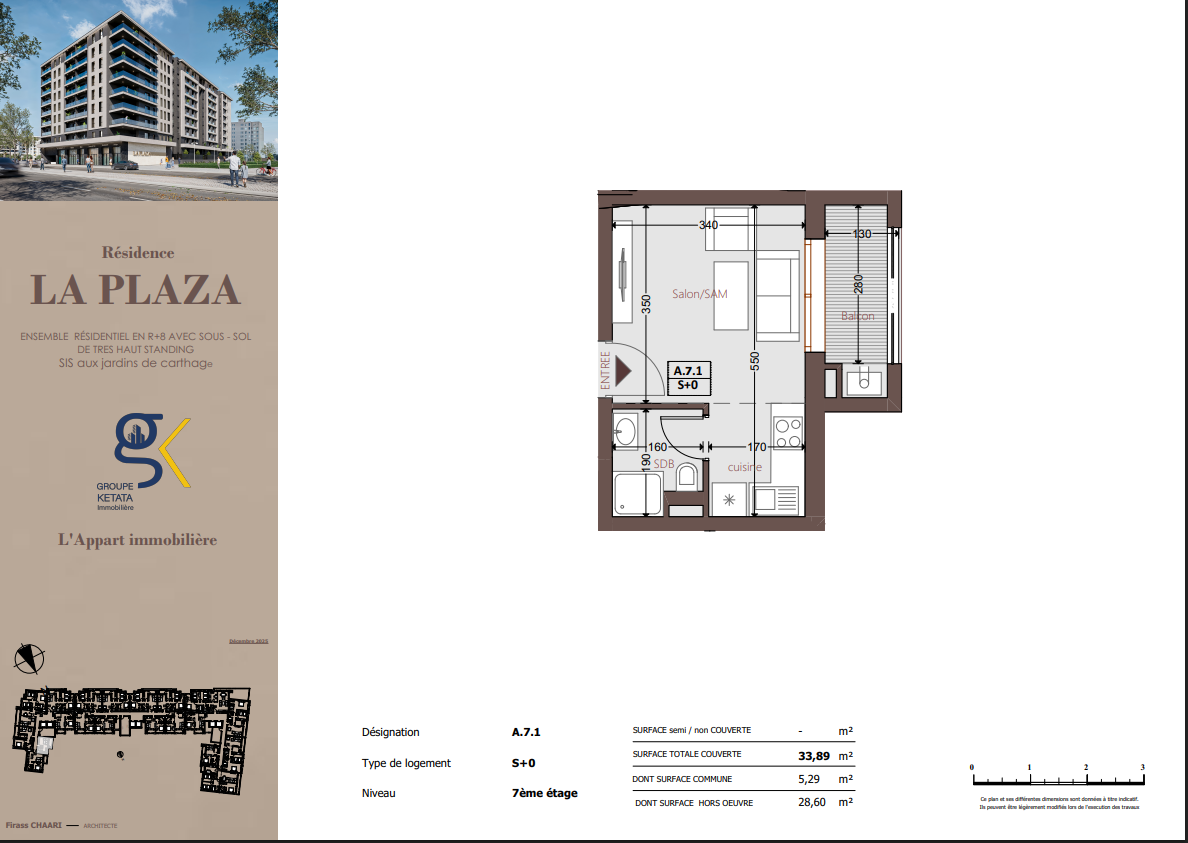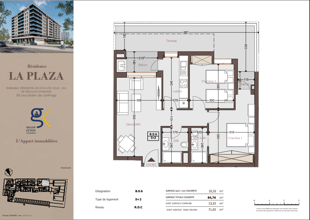 Idéalement située au cœur des Jardins de Carthage, La Plazza incarne une nouvelle vision de la résidence haut standing. Signée par Groupe Ketata Immobilier, elle offre un cadre de vie alliant confort absolu, élégance contemporaine et sérénité, au sein d’un quartier prisé et parfaitement connecté à toutes les commodités essentielles. Son architecture moderne reflète un subtil équilibre entre prestige et design actuel.