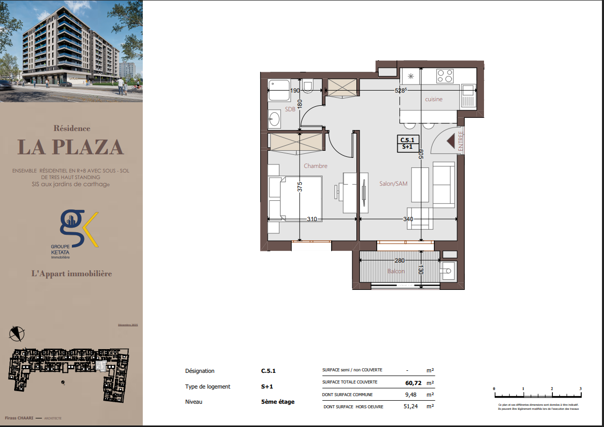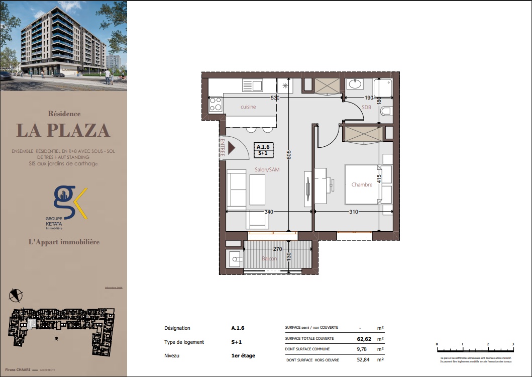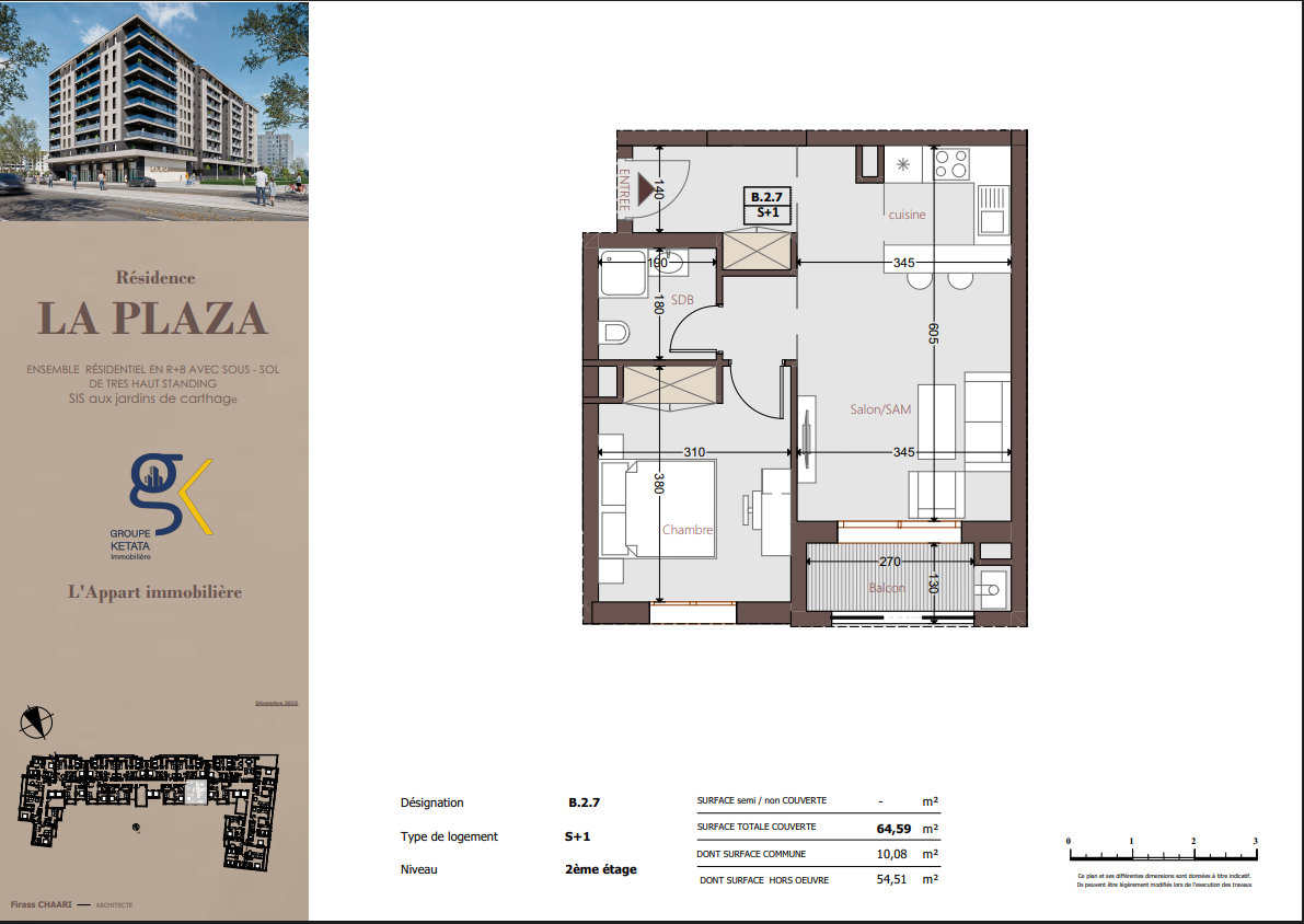 La Plazza se compose de blocs résidentiels harmonieusement pensés, comprenant un sous-sol, un rez-de-chaussée et plusieurs étages, intégrant également des locaux commerciaux. La résidence propose des appartements S+1, S+2 et S+3, conçus selon les standards du très haut standing, offrant des espaces fonctionnels, lumineux et parfaitement optimisés pour répondre à tous les styles de vie.