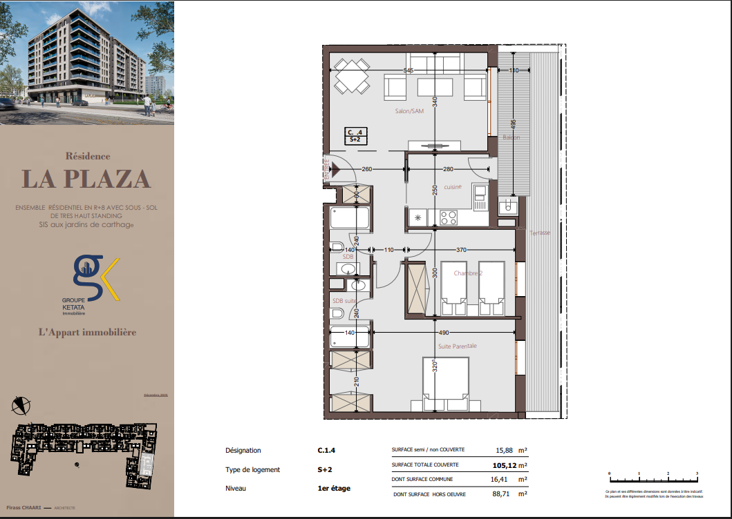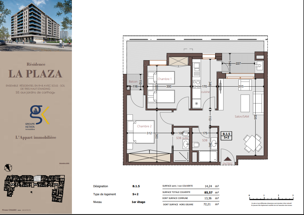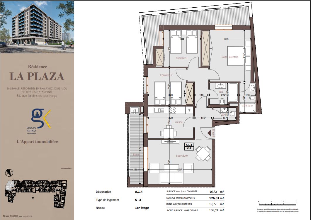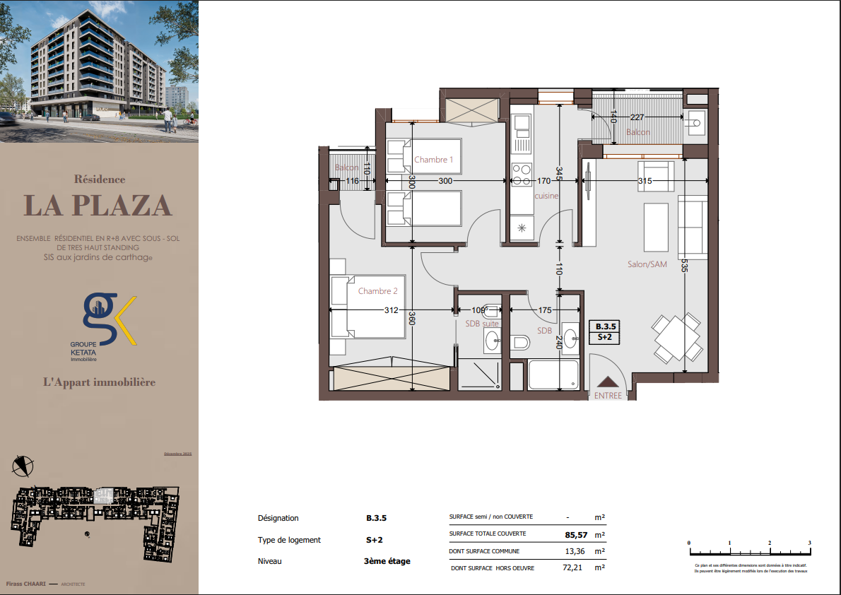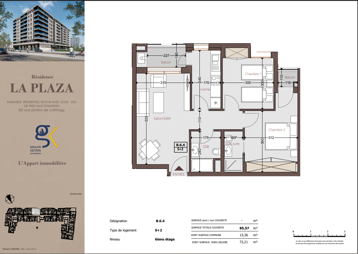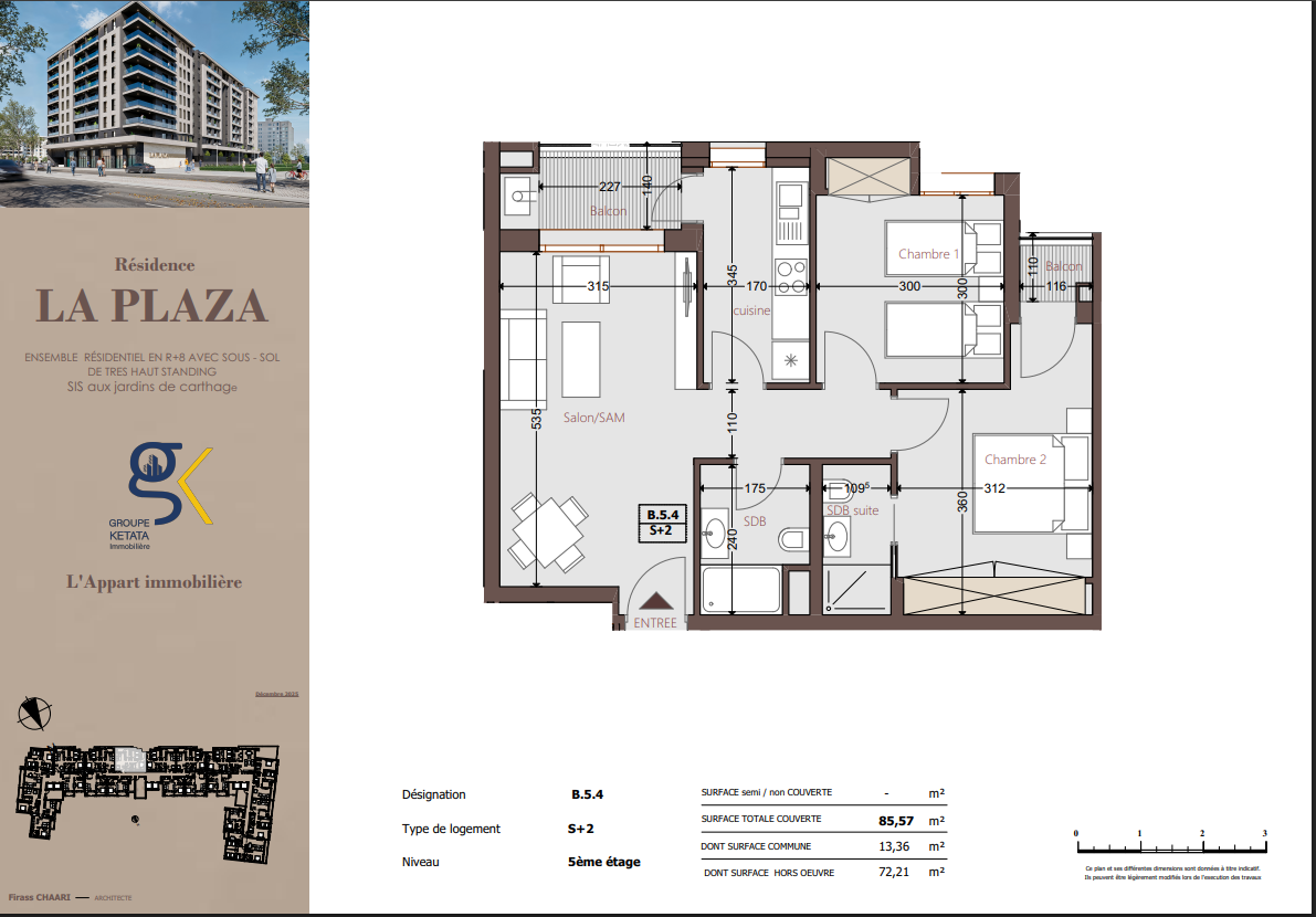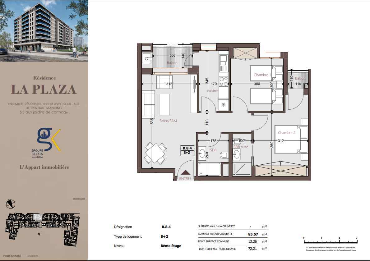Idéalement située au cœur des Jardins de Carthage, La Plazza incarne une nouvelle vision de la résidence haut standing. Signée par Groupe Ketata Immobilier, elle offre un cadre de vie alliant confort absolu, élégance contemporaine et sérénité, au sein d’un quartier prisé et parfaitement connecté à toutes les commodités essentielles. Son architecture moderne reflète un subtil équilibre entre prestige et design actuel.