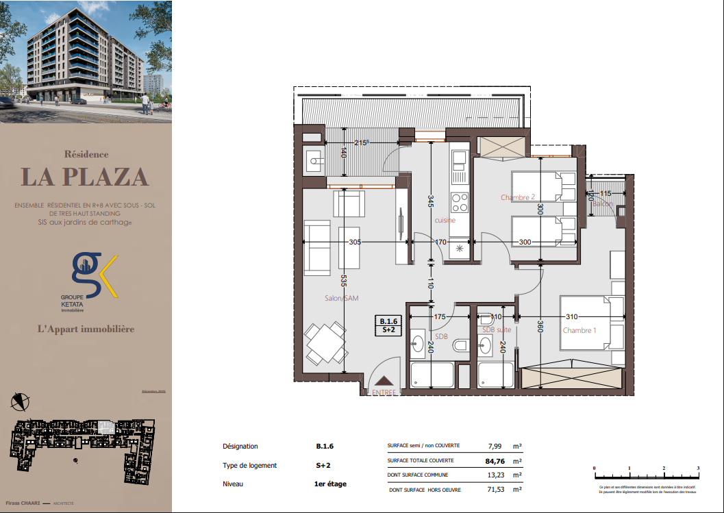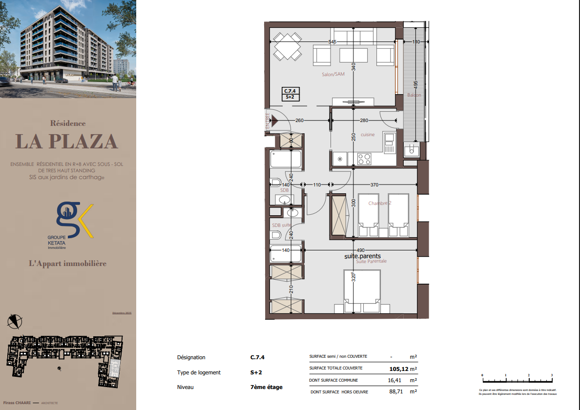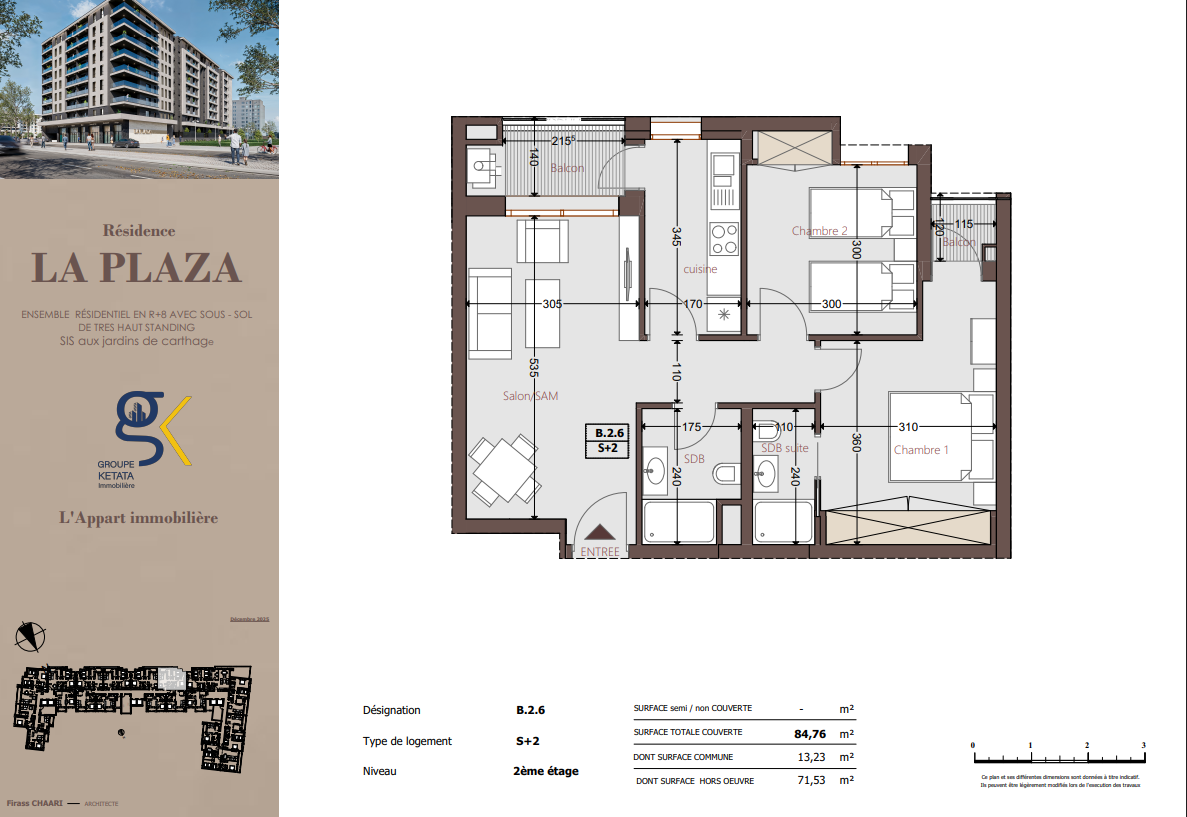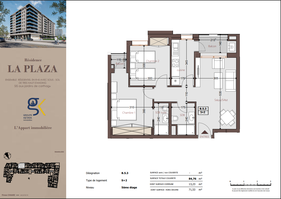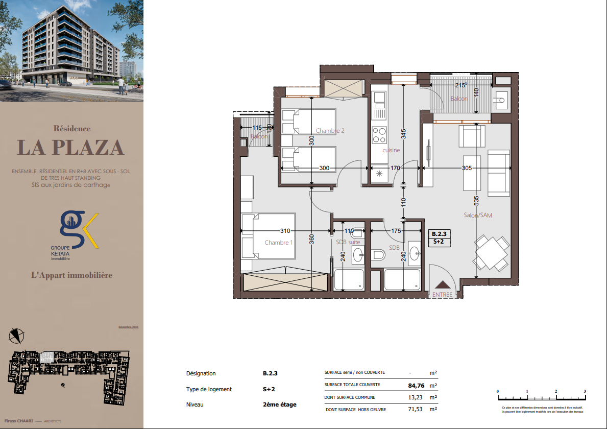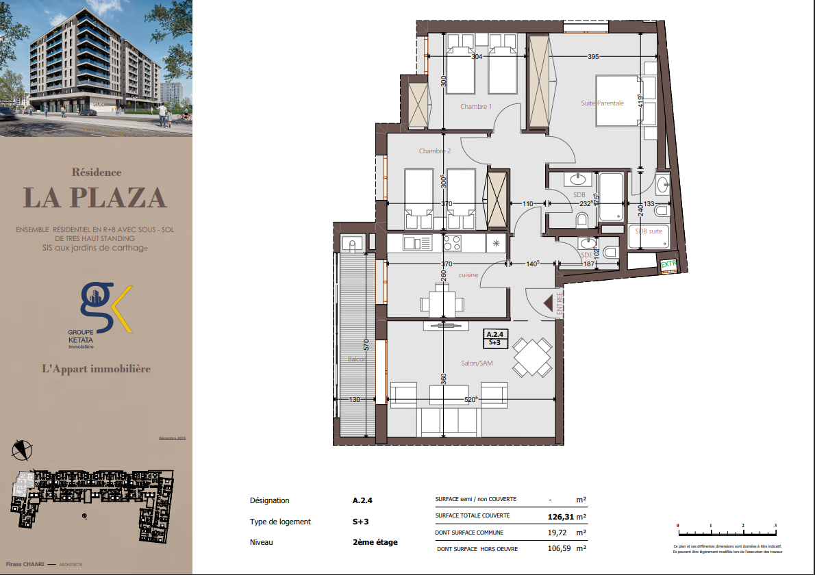 Idéalement située au cœur des Jardins de Carthage, La Plazza incarne une nouvelle vision de la résidence haut standing. Signée par Groupe Ketata Immobilier, elle offre un cadre de vie alliant confort absolu, élégance contemporaine et sérénité, au sein d’un quartier prisé et parfaitement connecté à toutes les commodités essentielles. Son architecture moderne reflète un subtil équilibre entre prestige et design actuel.