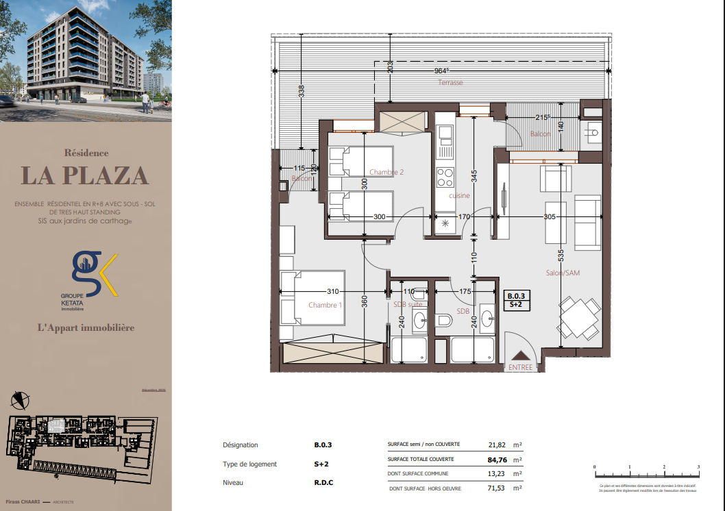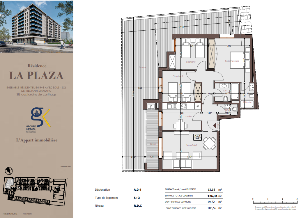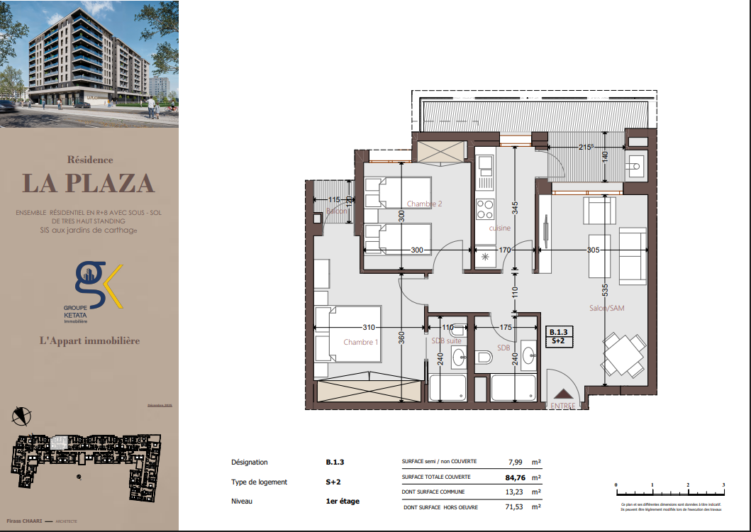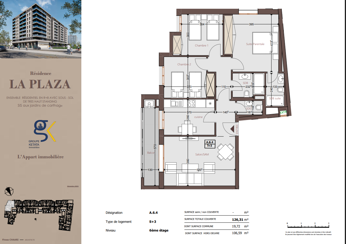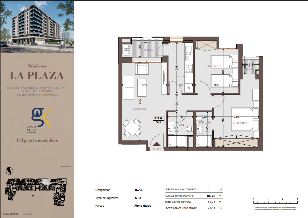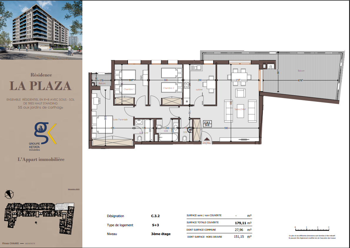 Idéalement située au cœur des Jardins de Carthage, La Plazza incarne une nouvelle vision de la résidence haut standing. Signée par Groupe Ketata Immobilier, elle offre un cadre de vie alliant confort absolu, élégance contemporaine et sérénité, au sein d’un quartier prisé et parfaitement connecté à toutes les commodités essentielles. Son architecture moderne reflète un subtil équilibre entre prestige et design actuel.