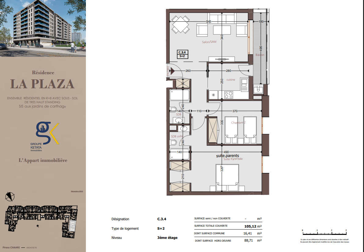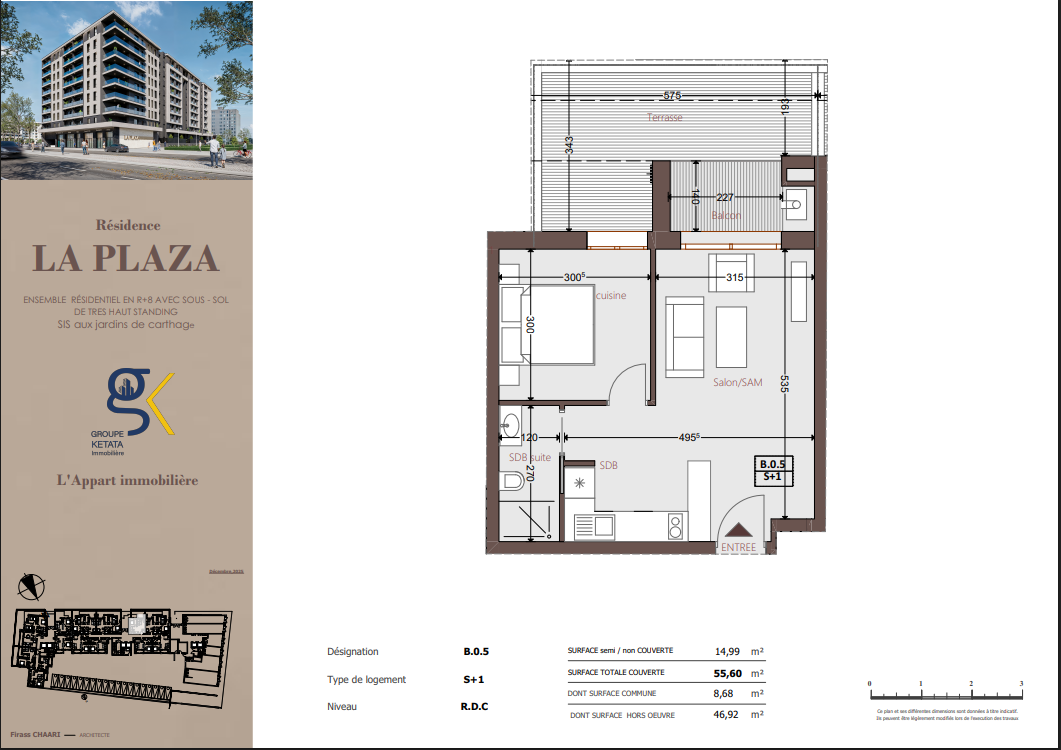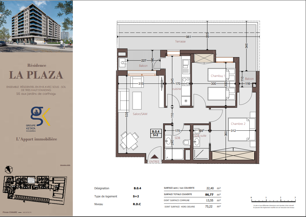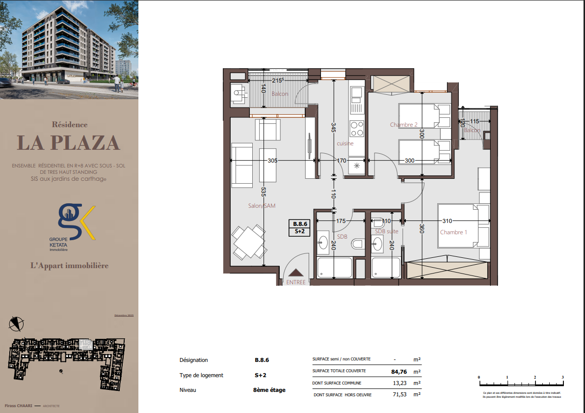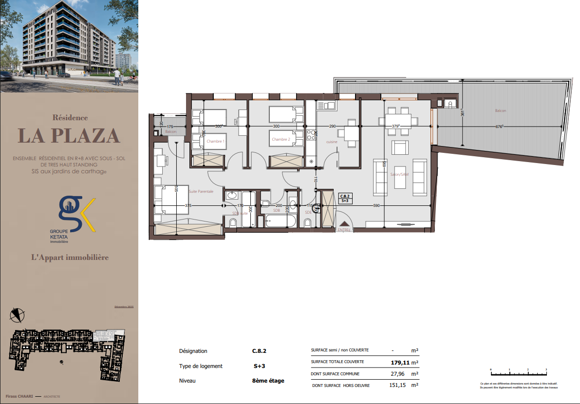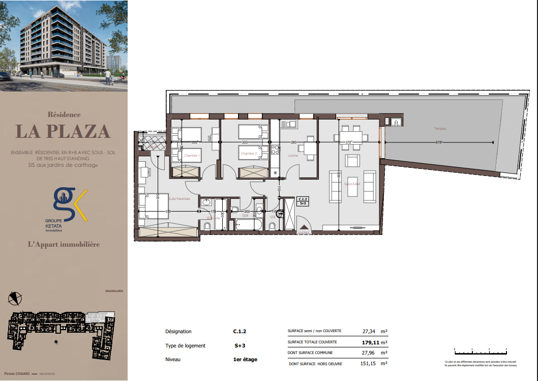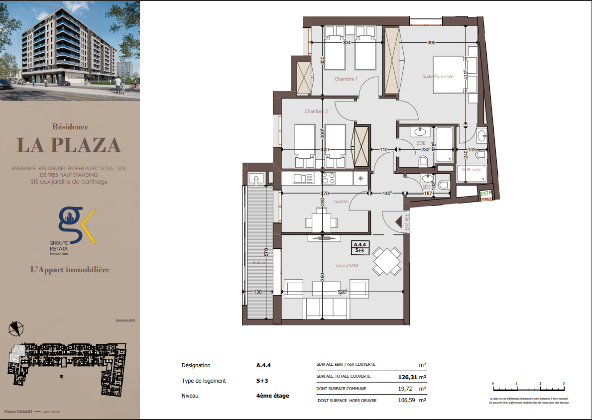 Idéalement située au cœur des Jardins de Carthage, La Plazza incarne une nouvelle vision de la résidence haut standing. Signée par Groupe Ketata Immobilier, elle offre un cadre de vie alliant confort absolu, élégance contemporaine et sérénité, au sein d’un quartier prisé et parfaitement connecté à toutes les commodités essentielles. Son architecture moderne reflète un subtil équilibre entre prestige et design actuel.