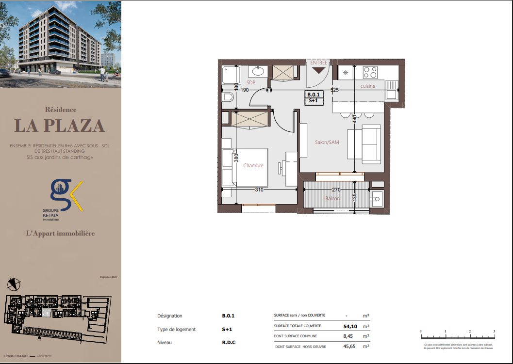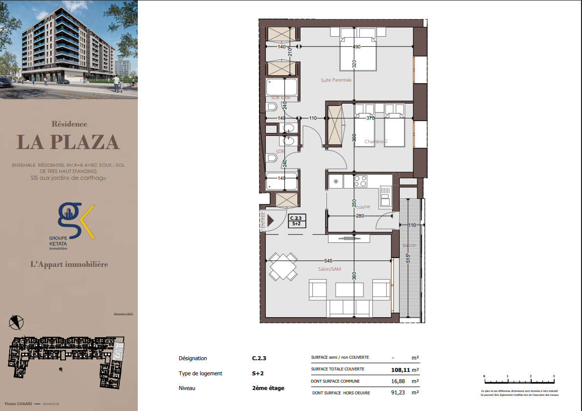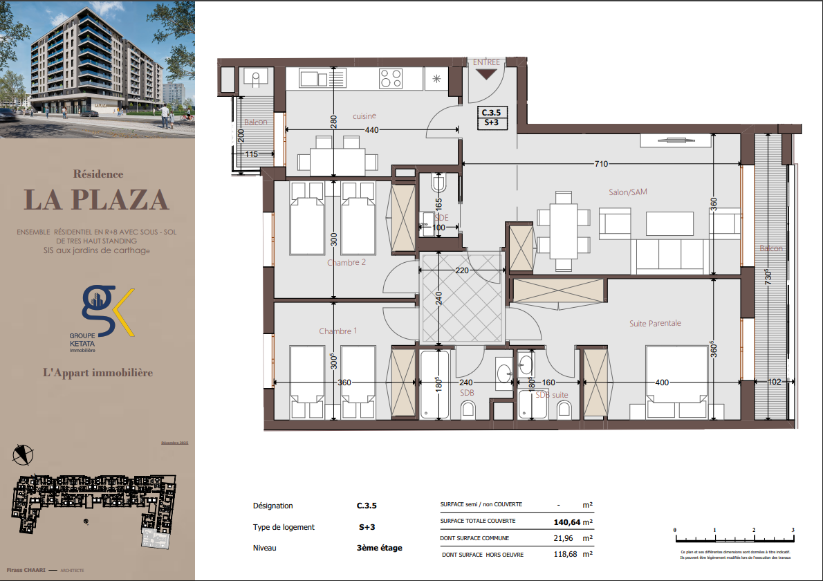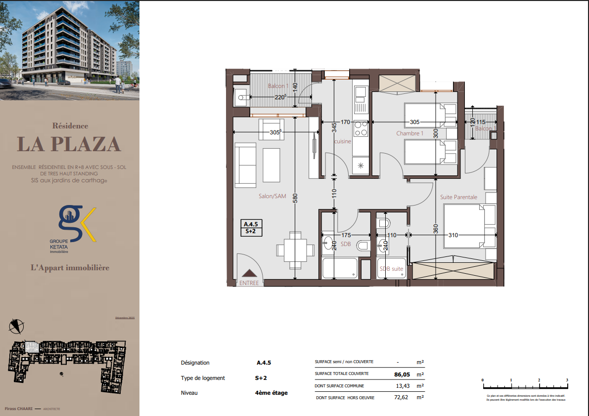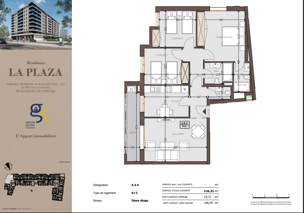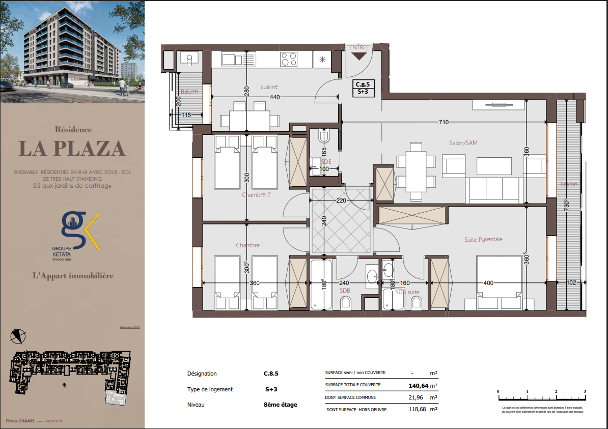 Idéalement située au cœur des Jardins de Carthage, La Plazza incarne une nouvelle vision de la résidence haut standing. Signée par Groupe Ketata Immobilier, elle offre un cadre de vie alliant confort absolu, élégance contemporaine et sérénité, au sein d’un quartier prisé et parfaitement connecté à toutes les commodités essentielles. Son architecture moderne reflète un subtil équilibre entre prestige et design actuel.