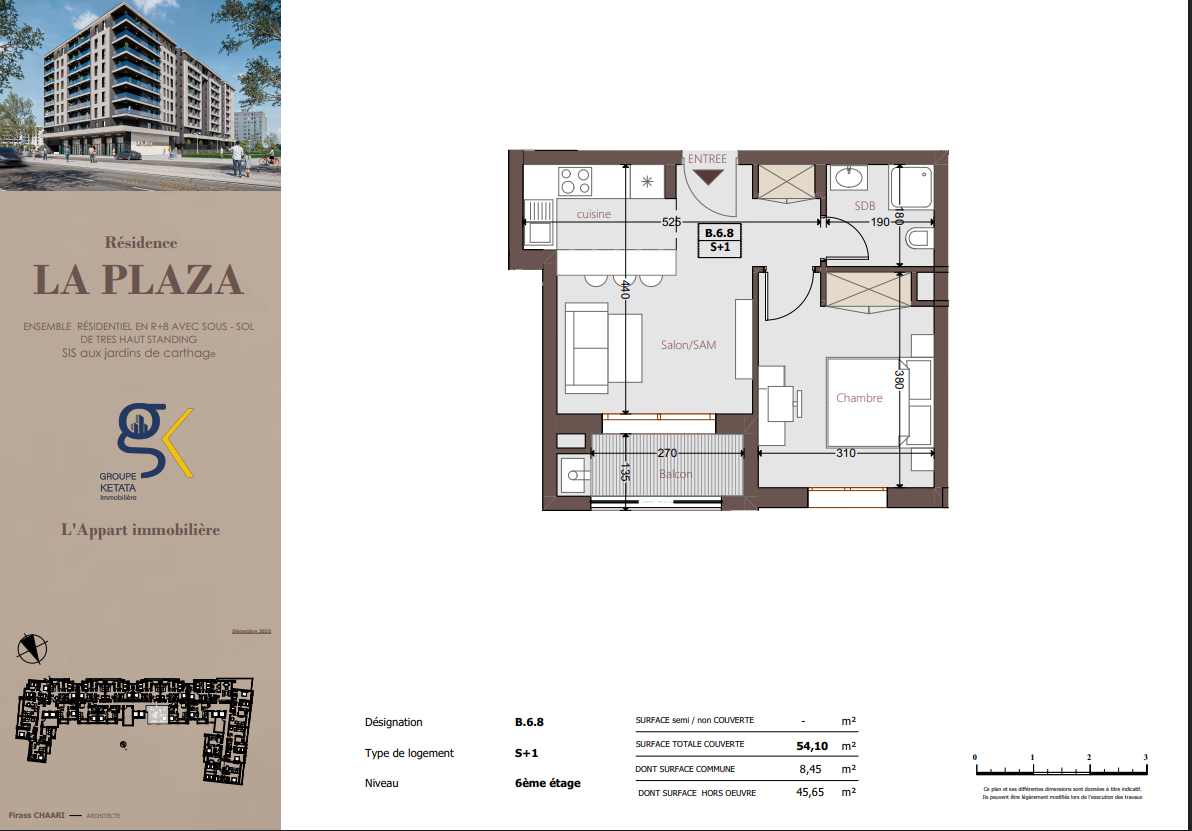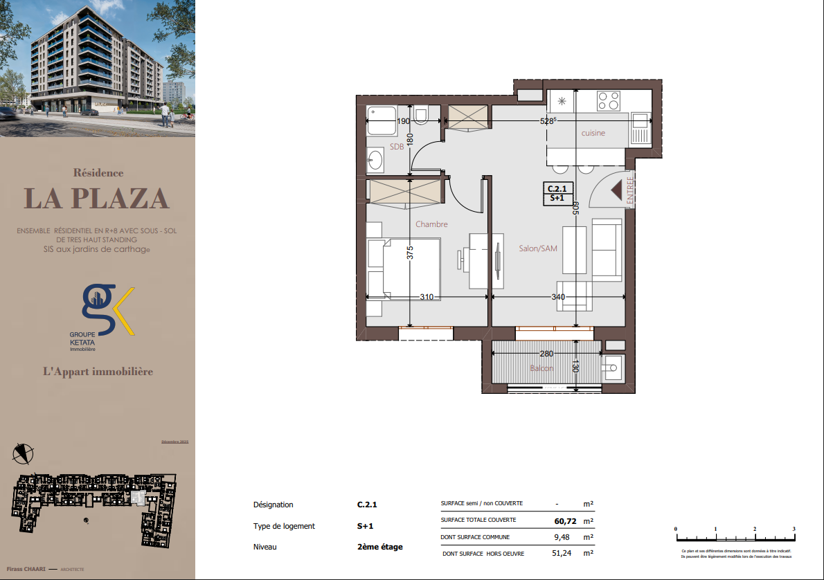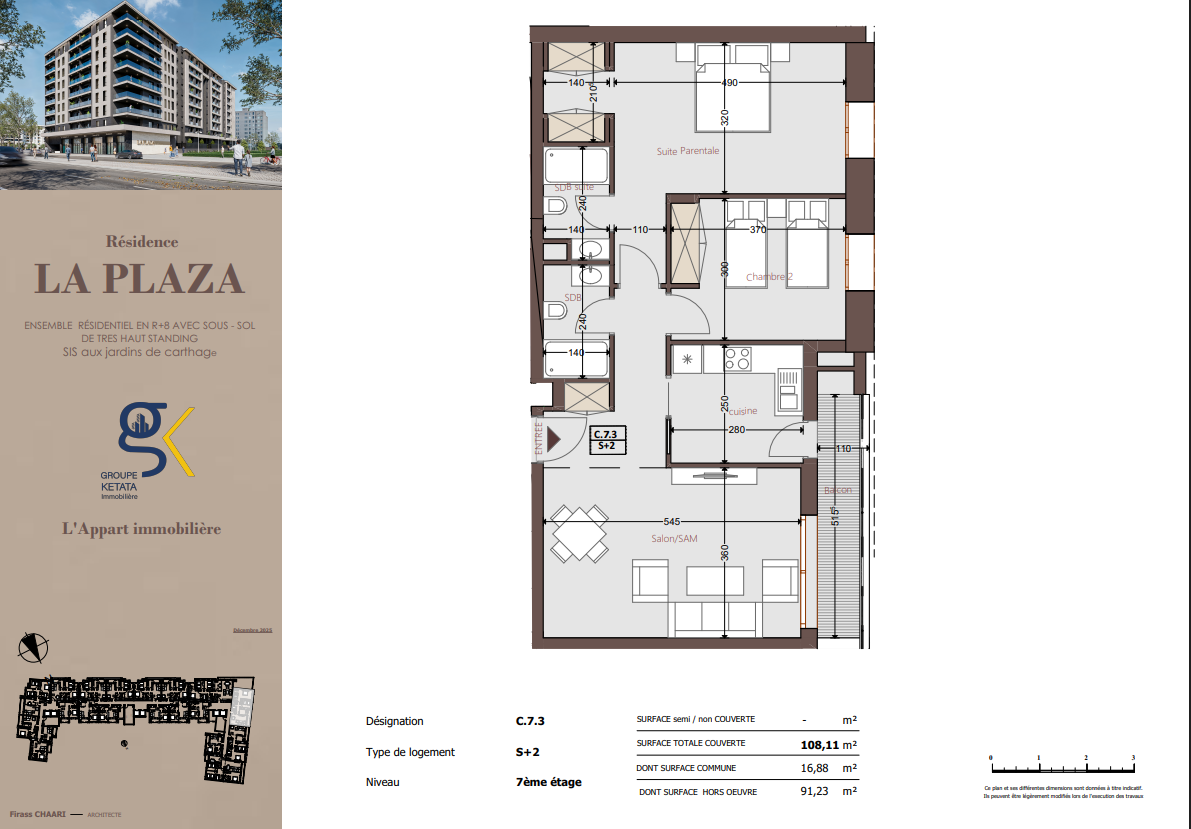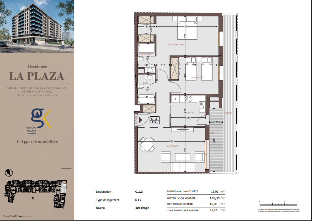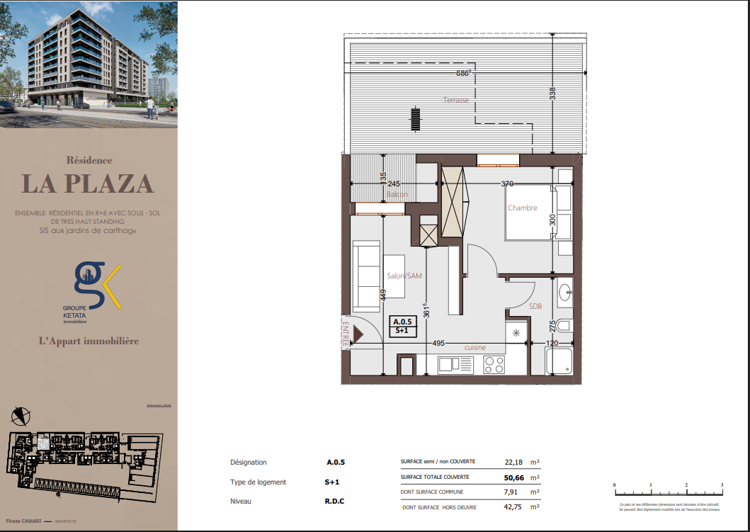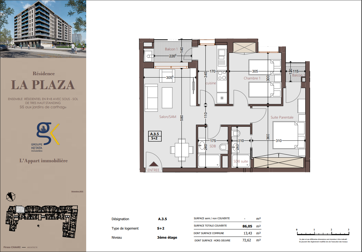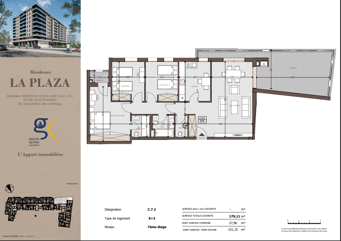 Idéalement située au cœur des Jardins de Carthage, La Plazza incarne une nouvelle vision de la résidence haut standing. Signée par Groupe Ketata Immobilier, elle offre un cadre de vie alliant confort absolu, élégance contemporaine et sérénité, au sein d’un quartier prisé et parfaitement connecté à toutes les commodités essentielles. Son architecture moderne reflète un subtil équilibre entre prestige et design actuel.