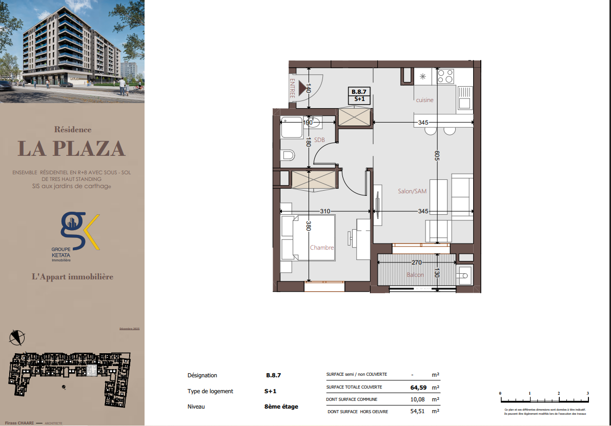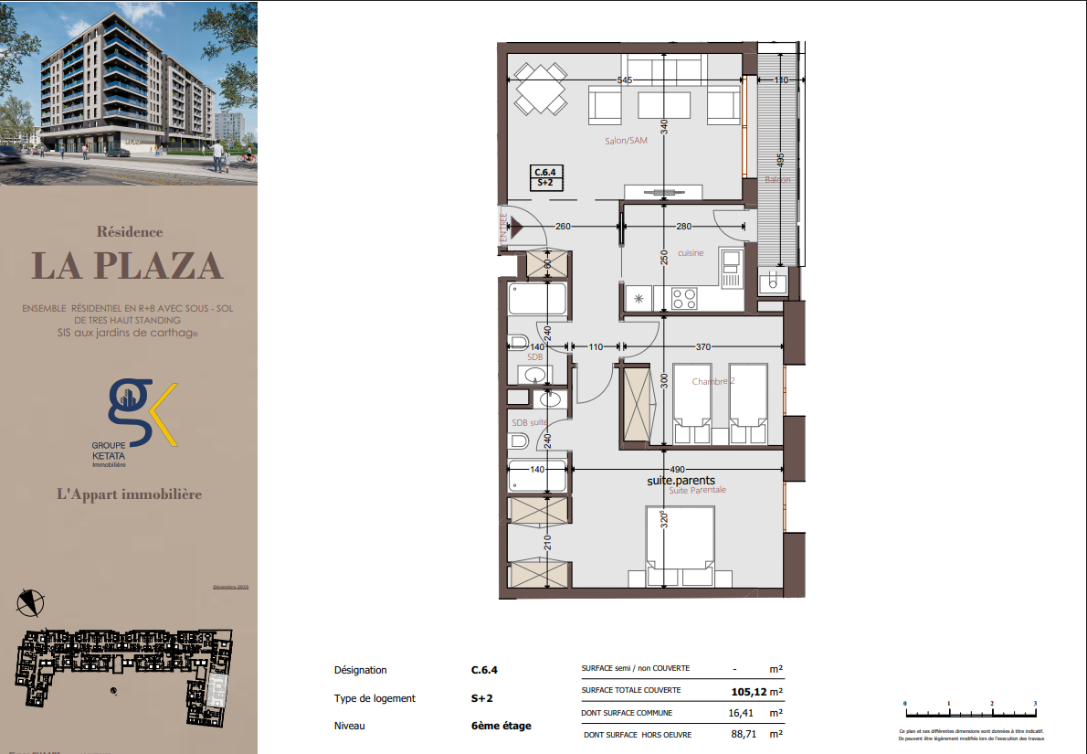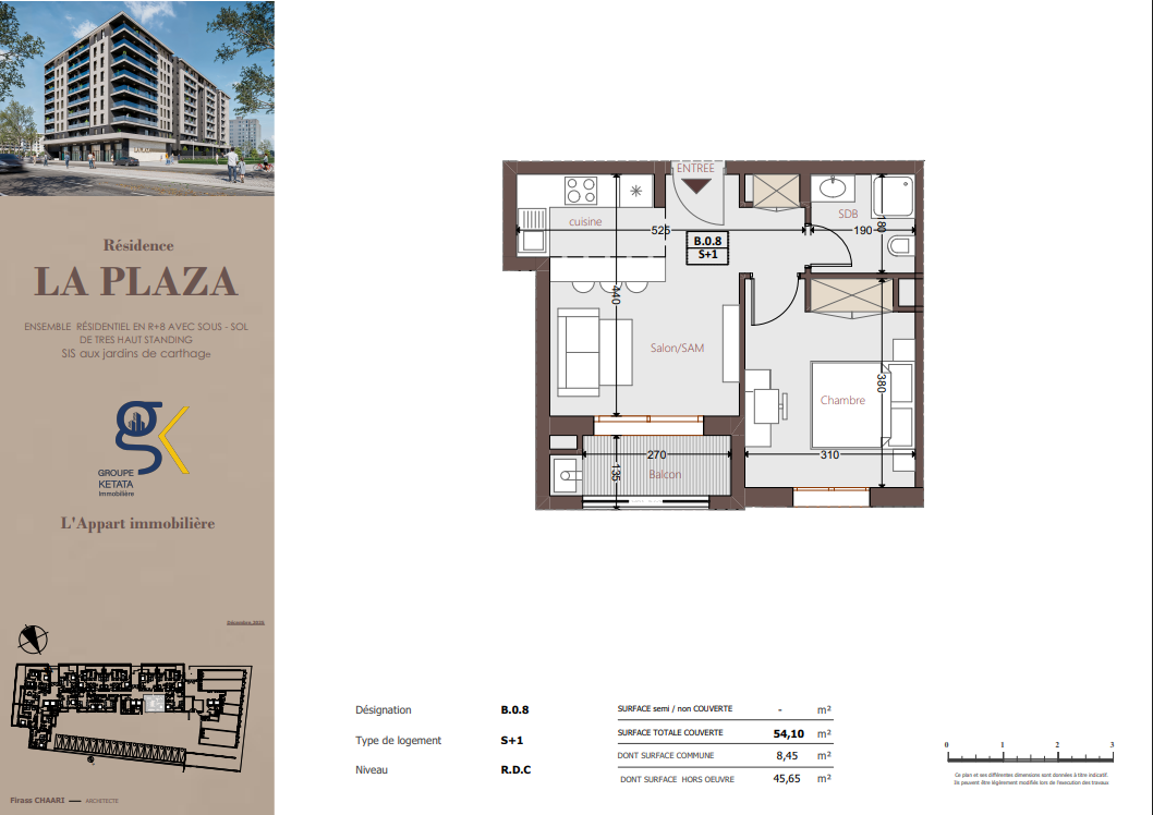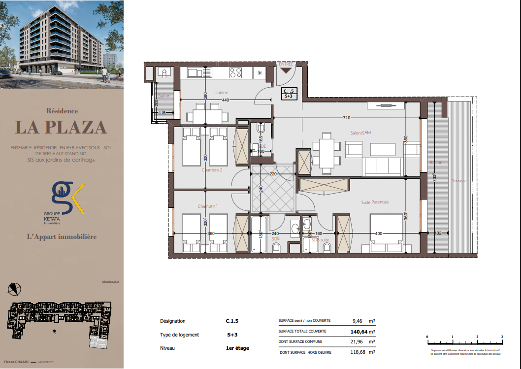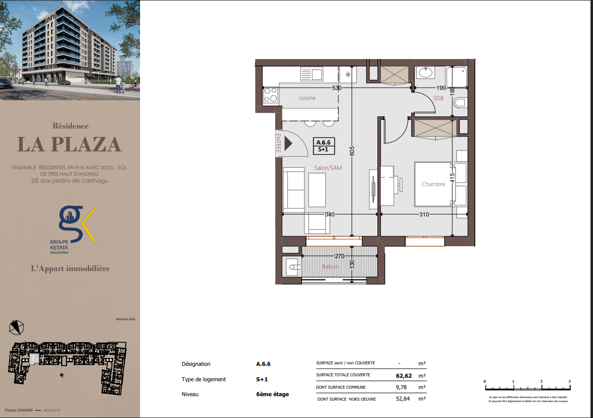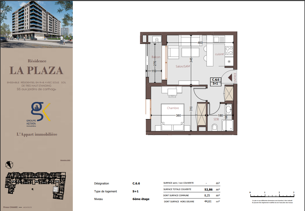 Idéalement située au cœur des Jardins de Carthage, La Plazza incarne une nouvelle vision de la résidence haut standing. Signée par Groupe Ketata Immobilier, elle offre un cadre de vie alliant confort absolu, élégance contemporaine et sérénité, au sein d’un quartier prisé et parfaitement connecté à toutes les commodités essentielles. Son architecture moderne reflète un subtil équilibre entre prestige et design actuel.