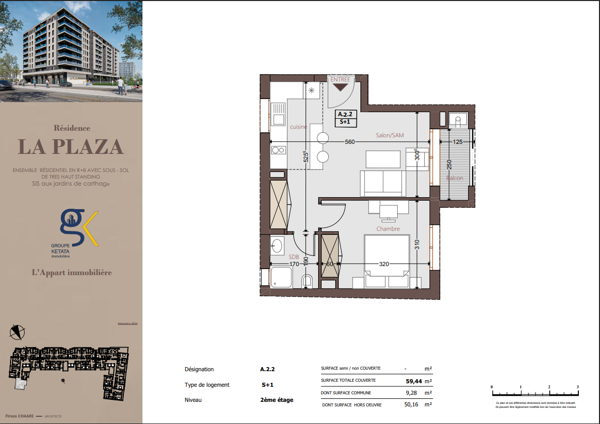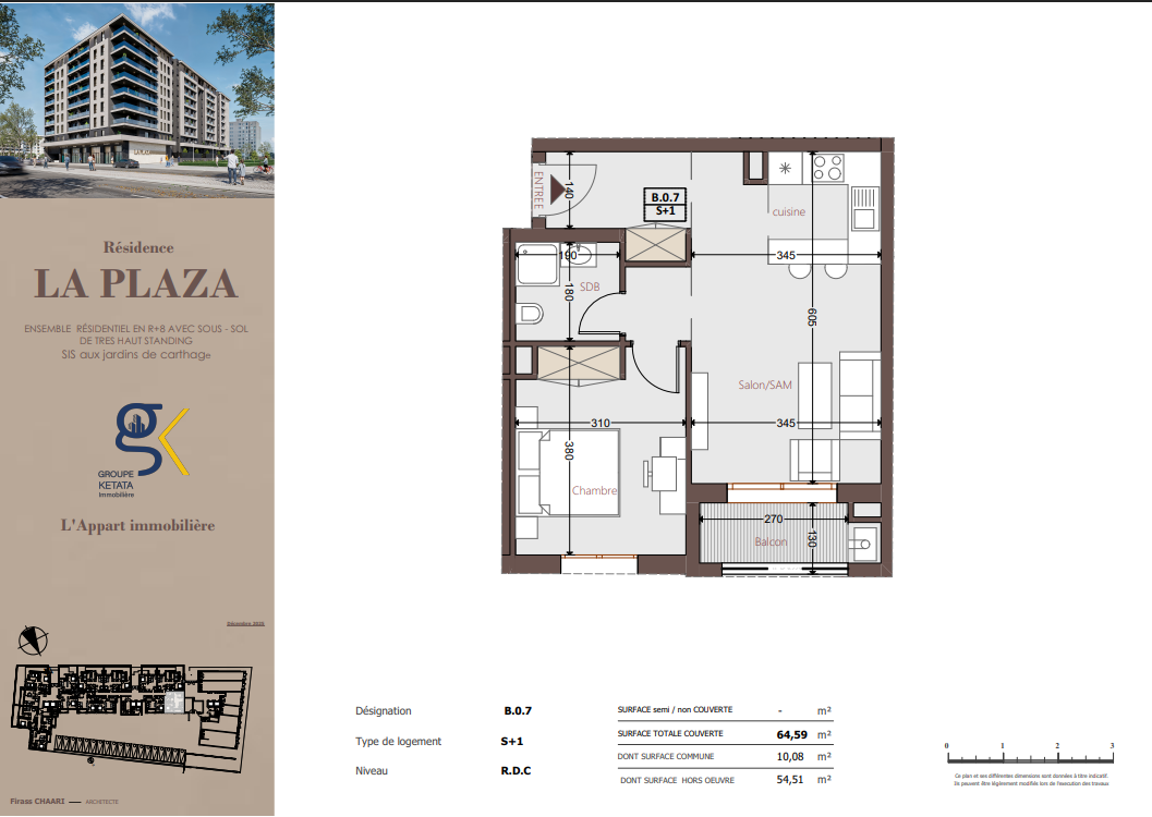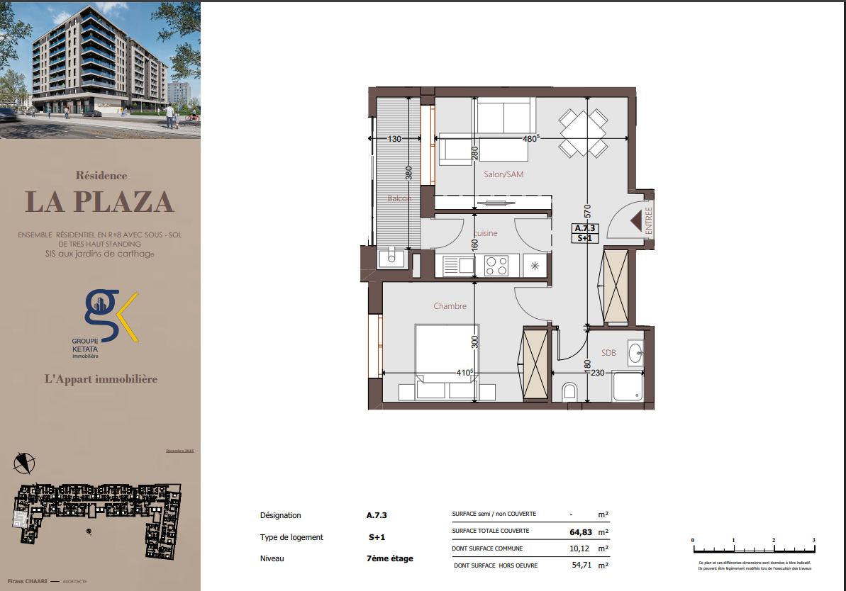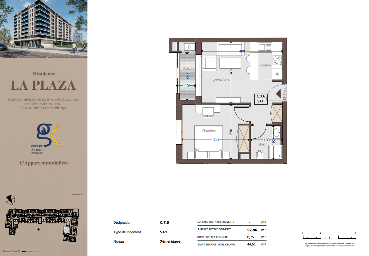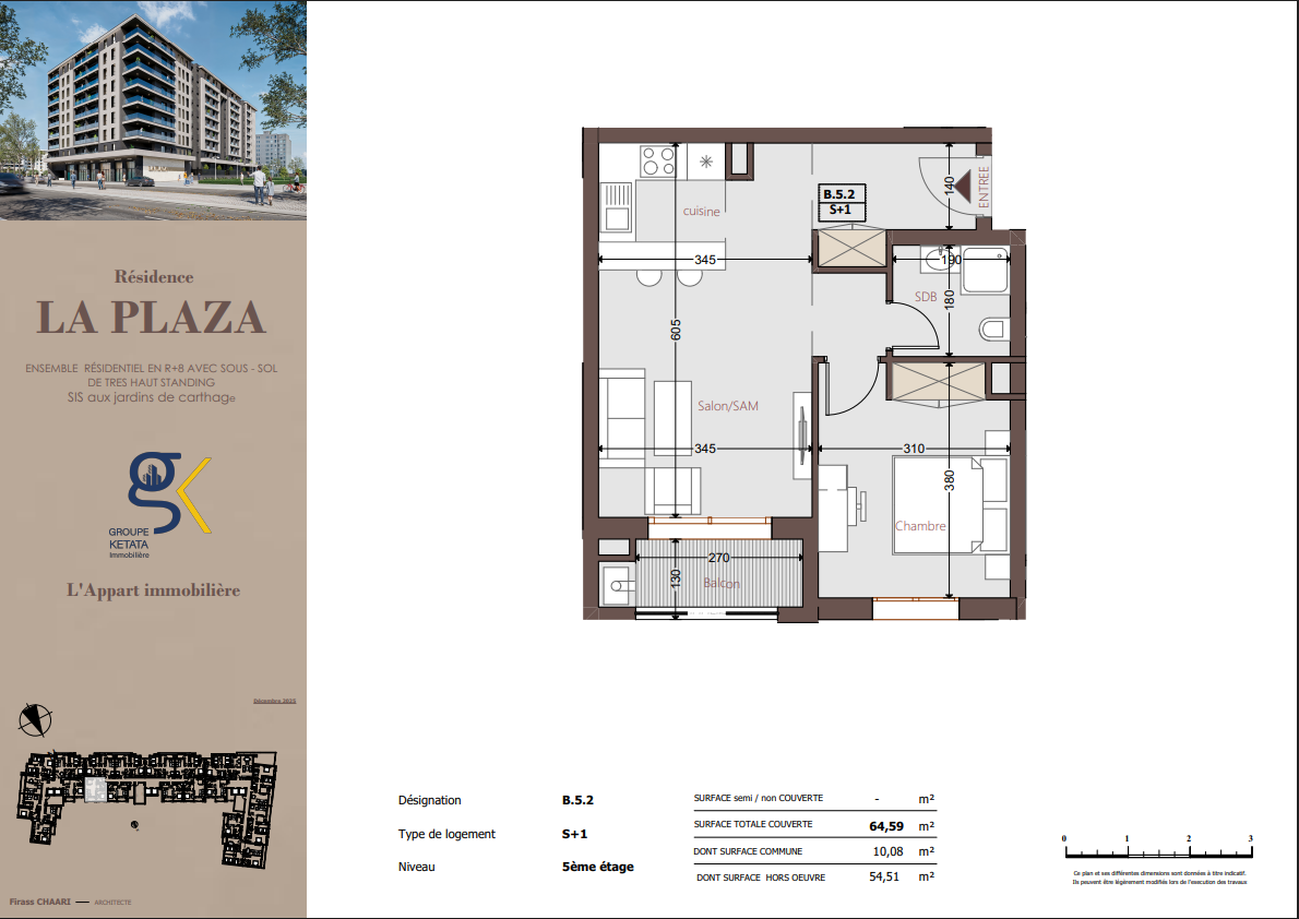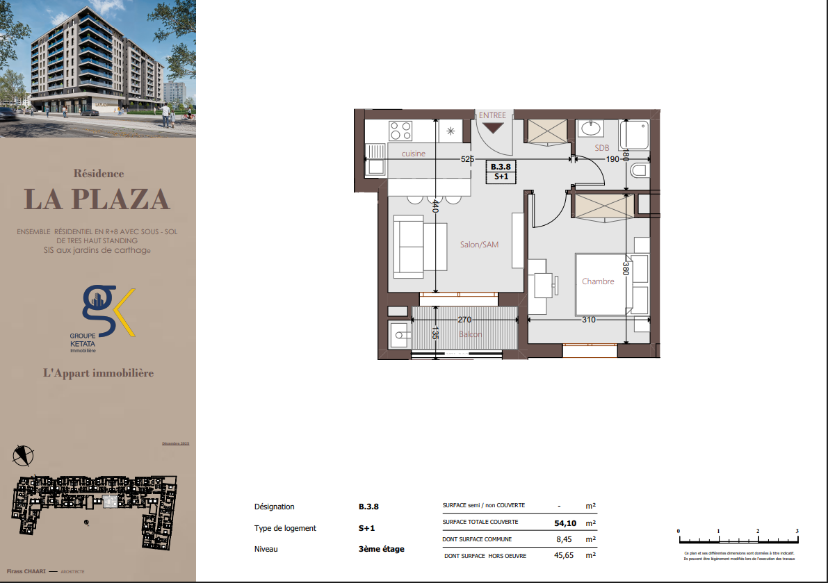Idéalement située au cœur des Jardins de Carthage, La Plazza incarne une nouvelle vision de la résidence haut standing. Signée par Groupe Ketata Immobilier, elle offre un cadre de vie alliant confort absolu, élégance contemporaine et sérénité, au sein d’un quartier prisé et parfaitement connecté à toutes les commodités essentielles. Son architecture moderne reflète un subtil équilibre entre prestige et design actuel.