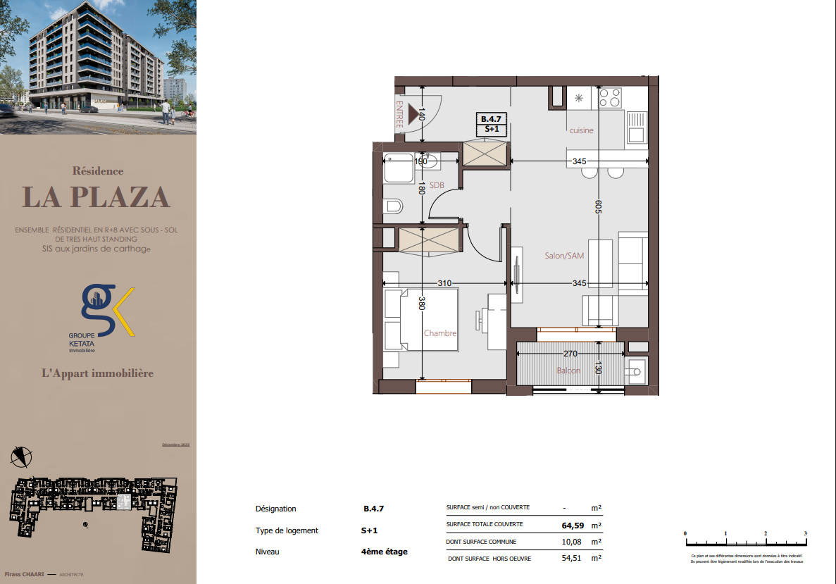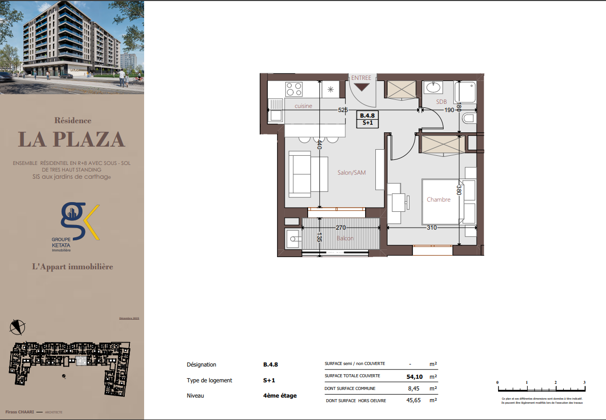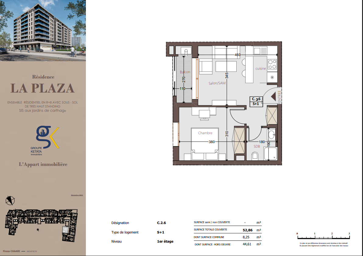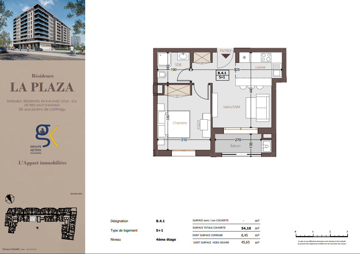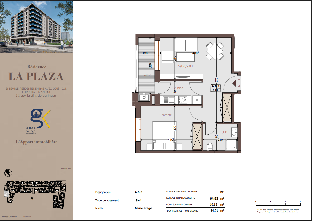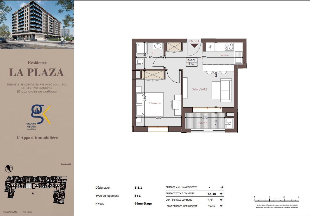 Idéalement située au cœur des Jardins de Carthage, La Plazza incarne une nouvelle vision de la résidence haut standing. Signée par Groupe Ketata Immobilier, elle offre un cadre de vie alliant confort absolu, élégance contemporaine et sérénité, au sein d’un quartier prisé et parfaitement connecté à toutes les commodités essentielles. Son architecture moderne reflète un subtil équilibre entre prestige et design actuel.