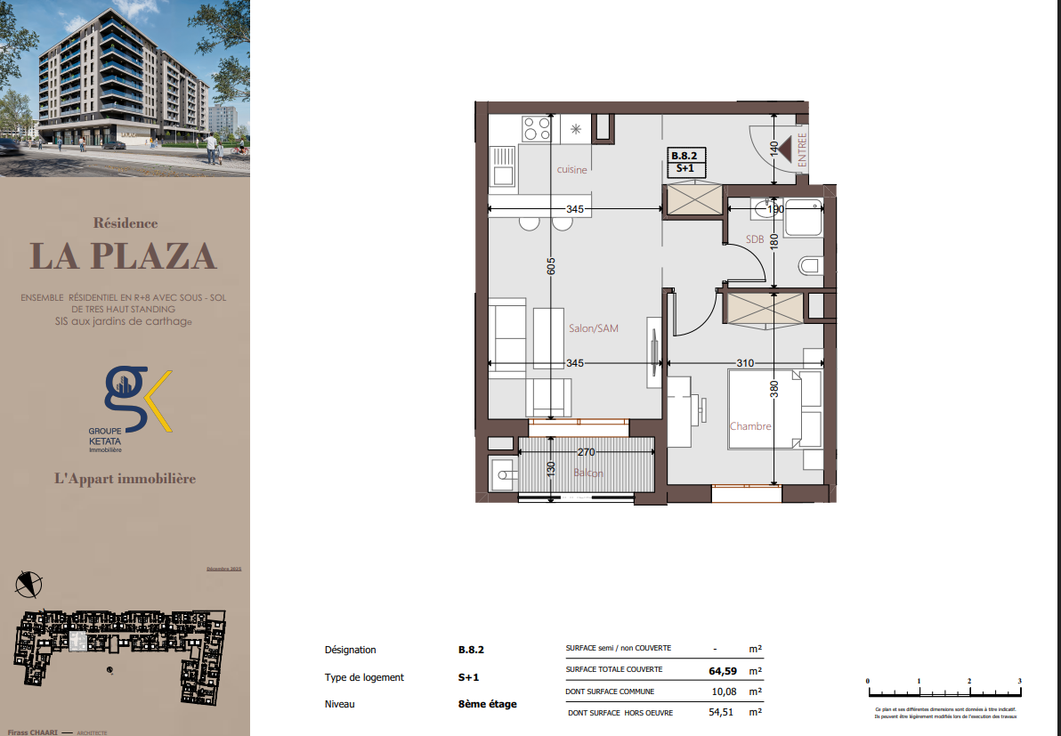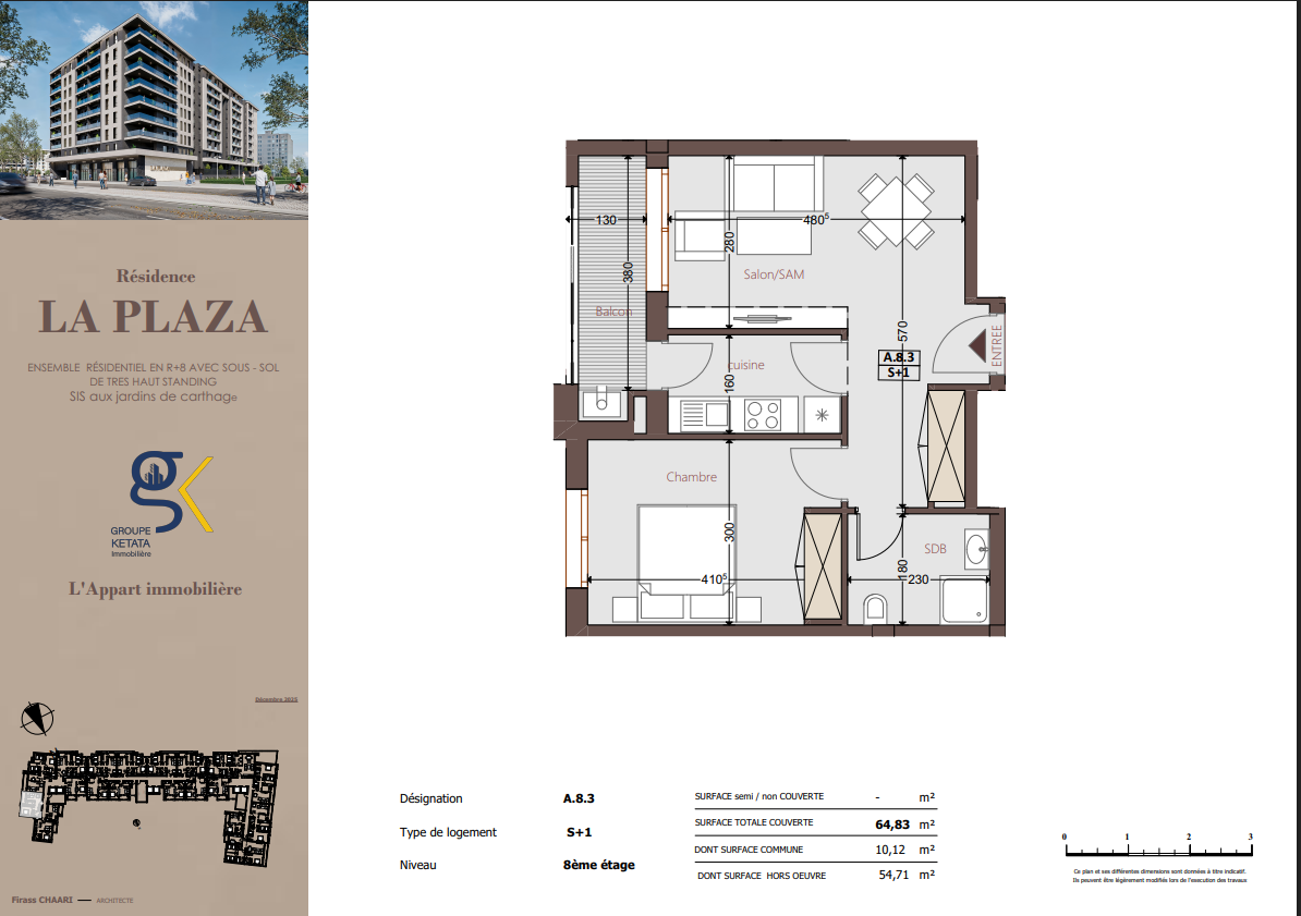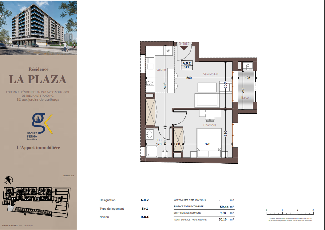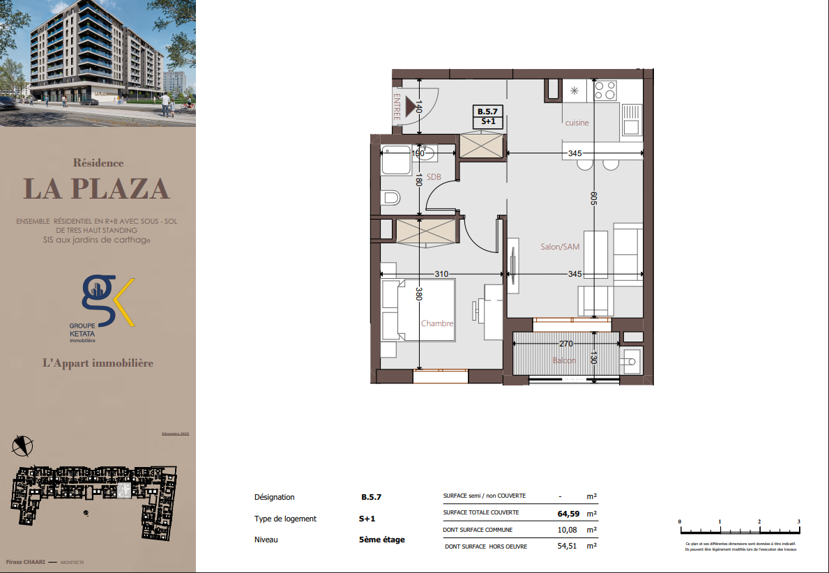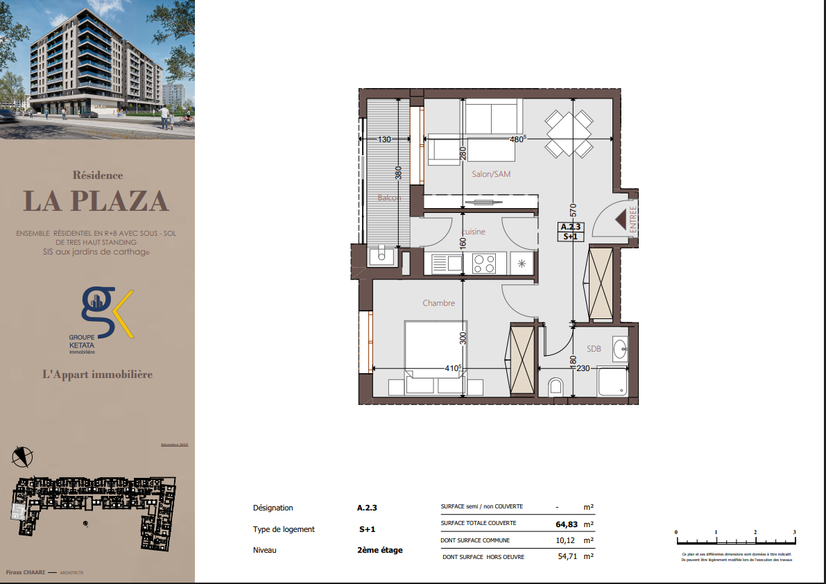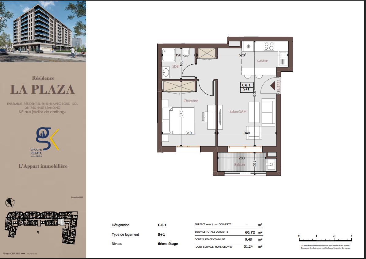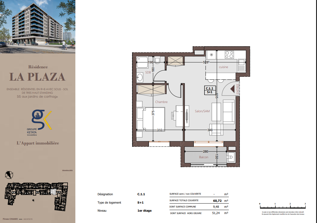 Idéalement située au cœur des Jardins de Carthage, La Plazza incarne une nouvelle vision de la résidence haut standing. Signée par Groupe Ketata Immobilier, elle offre un cadre de vie alliant confort absolu, élégance contemporaine et sérénité, au sein d’un quartier prisé et parfaitement connecté à toutes les commodités essentielles. Son architecture moderne reflète un subtil équilibre entre prestige et design actuel.