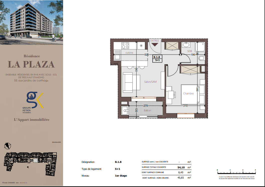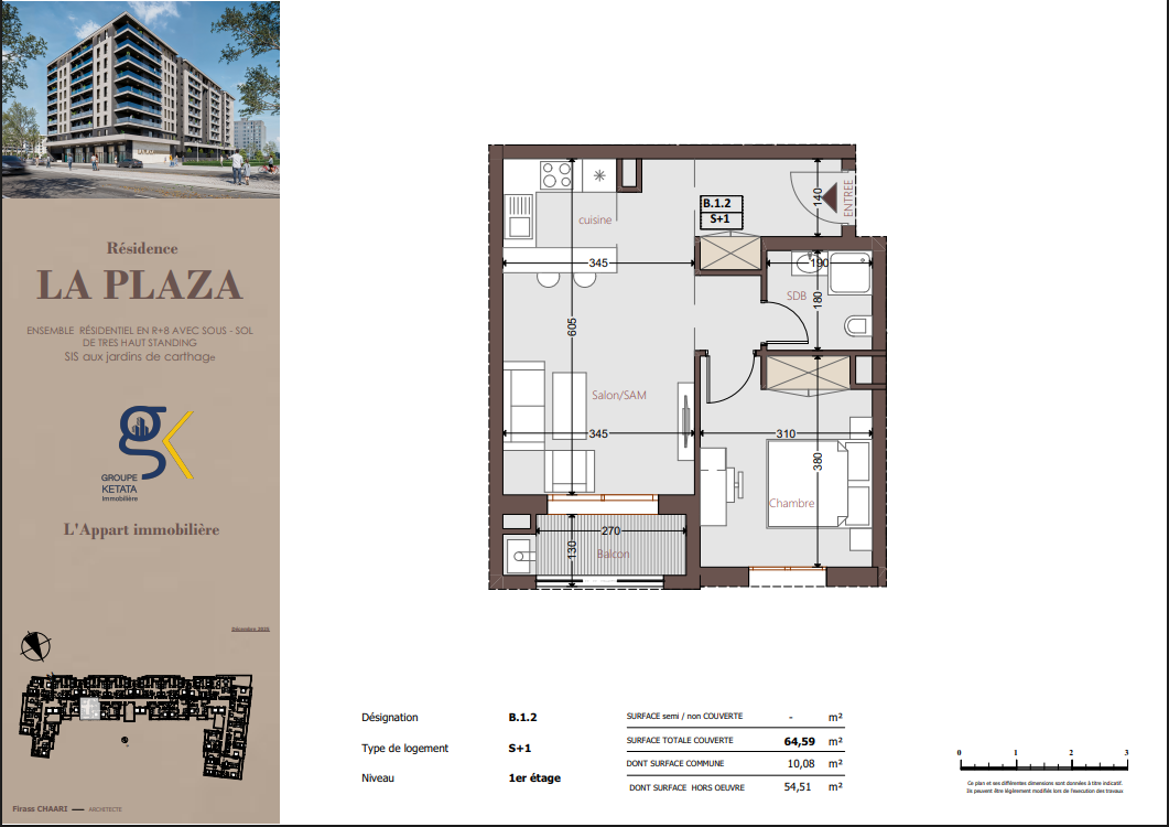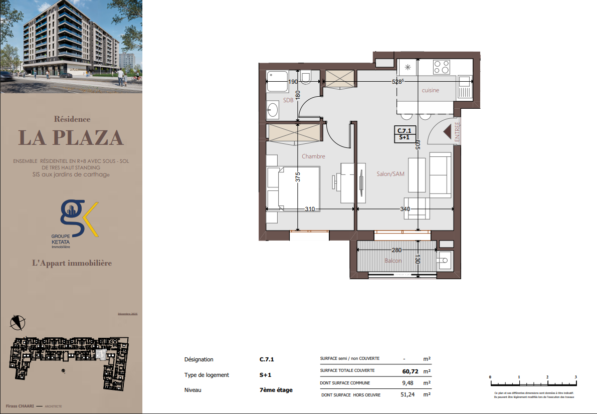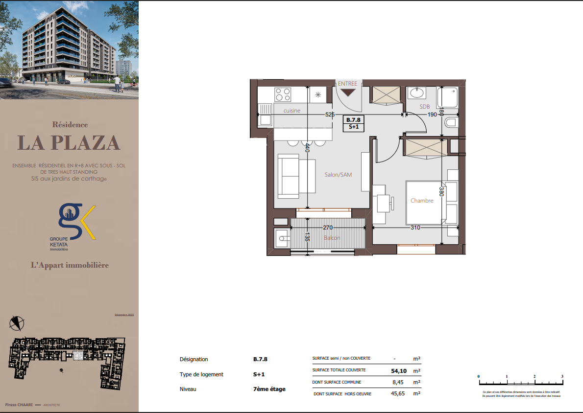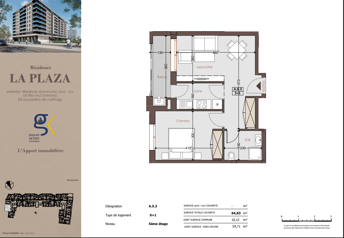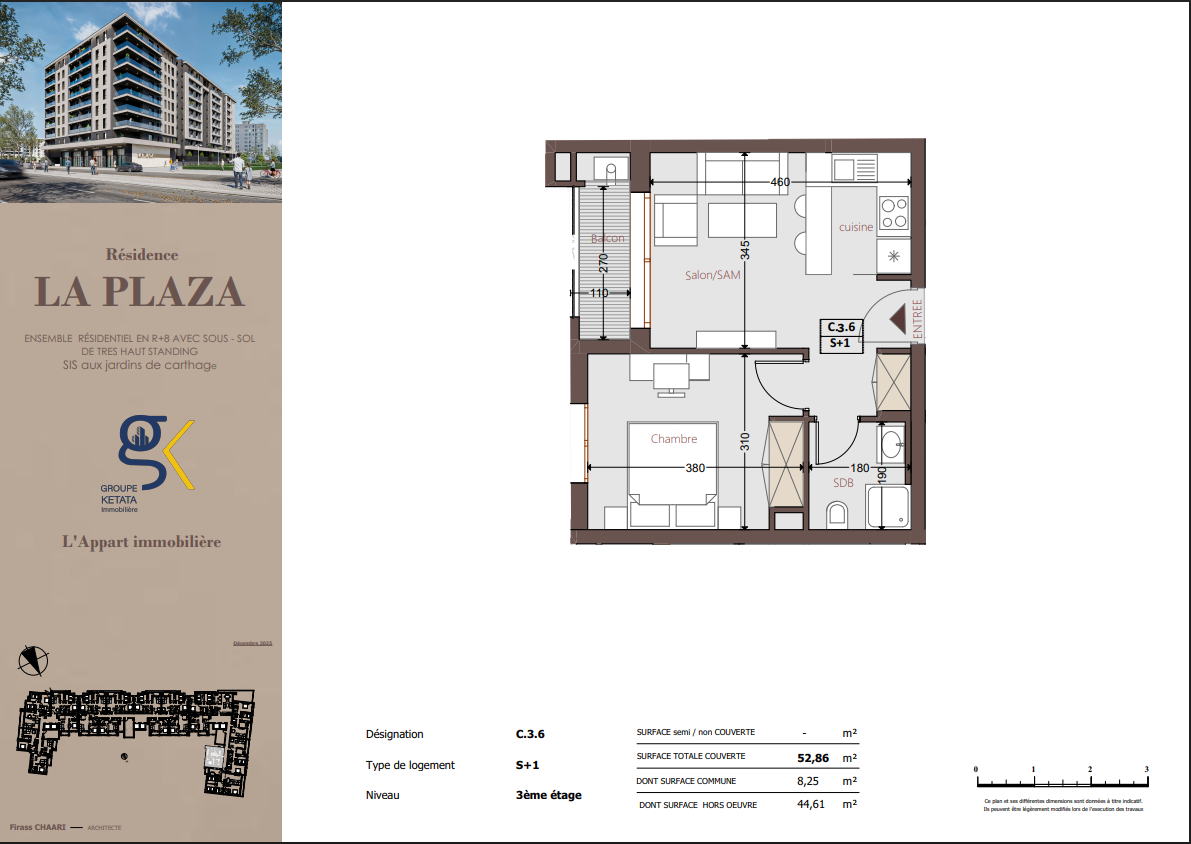 Idéalement située au cœur des Jardins de Carthage, La Plazza incarne une nouvelle vision de la résidence haut standing. Signée par Groupe Ketata Immobilier, elle offre un cadre de vie alliant confort absolu, élégance contemporaine et sérénité, au sein d’un quartier prisé et parfaitement connecté à toutes les commodités essentielles. Son architecture moderne reflète un subtil équilibre entre prestige et design actuel.