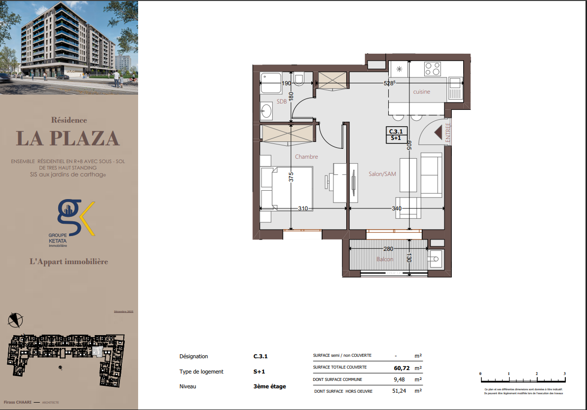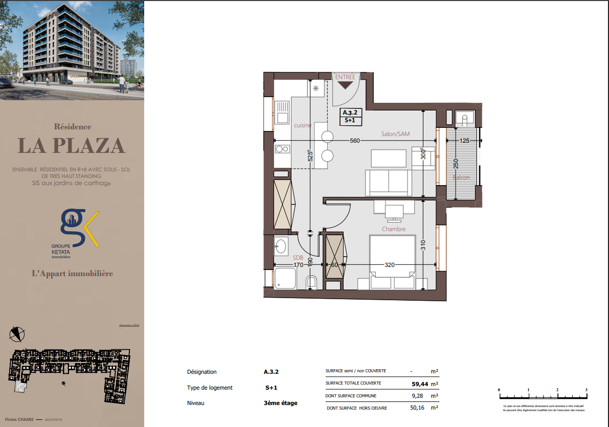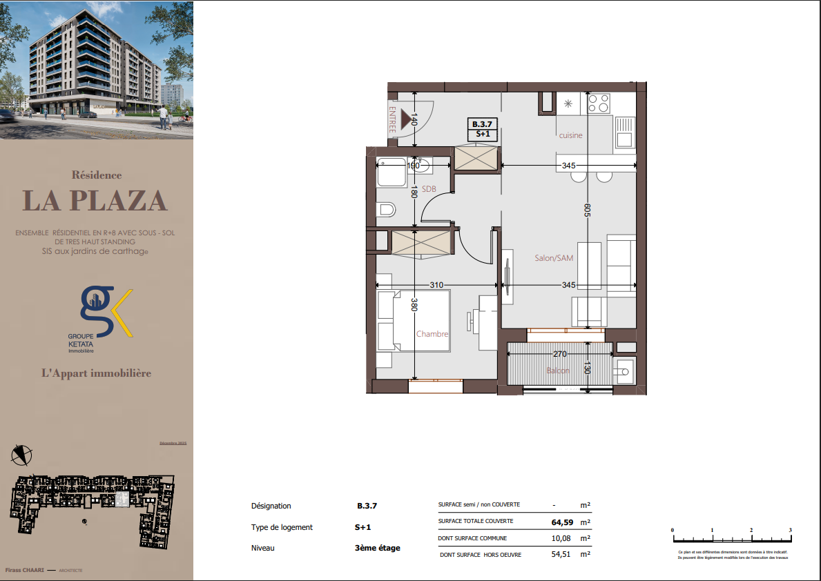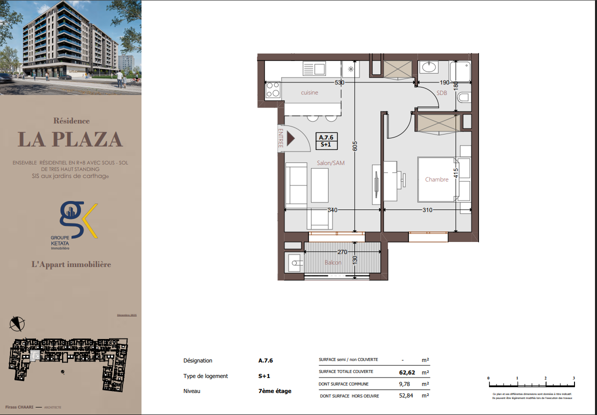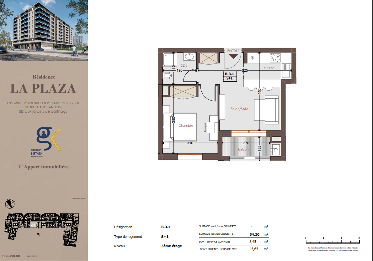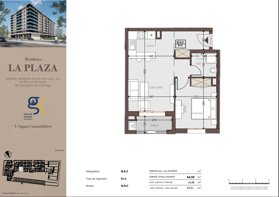 Idéalement située au cœur des Jardins de Carthage, La Plazza incarne une nouvelle vision de la résidence haut standing. Signée par Groupe Ketata Immobilier, elle offre un cadre de vie alliant confort absolu, élégance contemporaine et sérénité, au sein d’un quartier prisé et parfaitement connecté à toutes les commodités essentielles. Son architecture moderne reflète un subtil équilibre entre prestige et design actuel.
