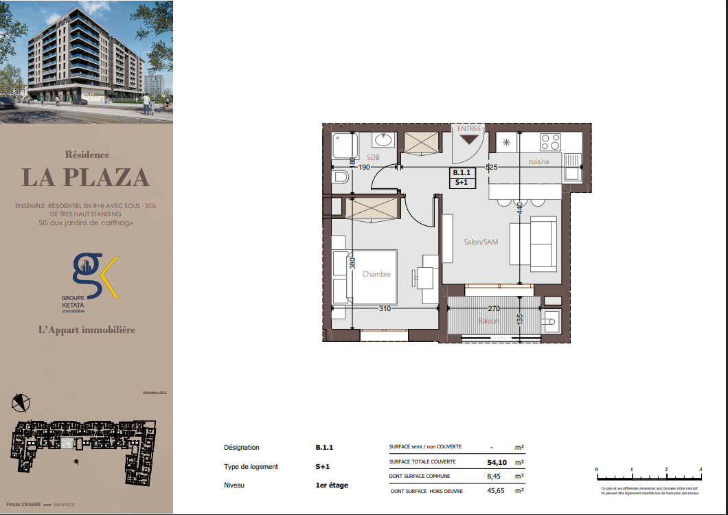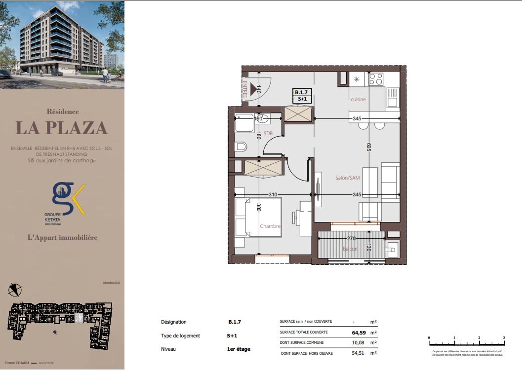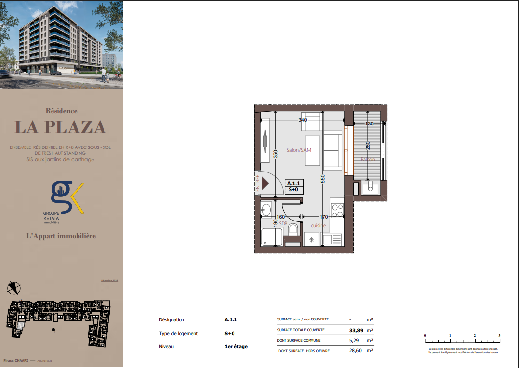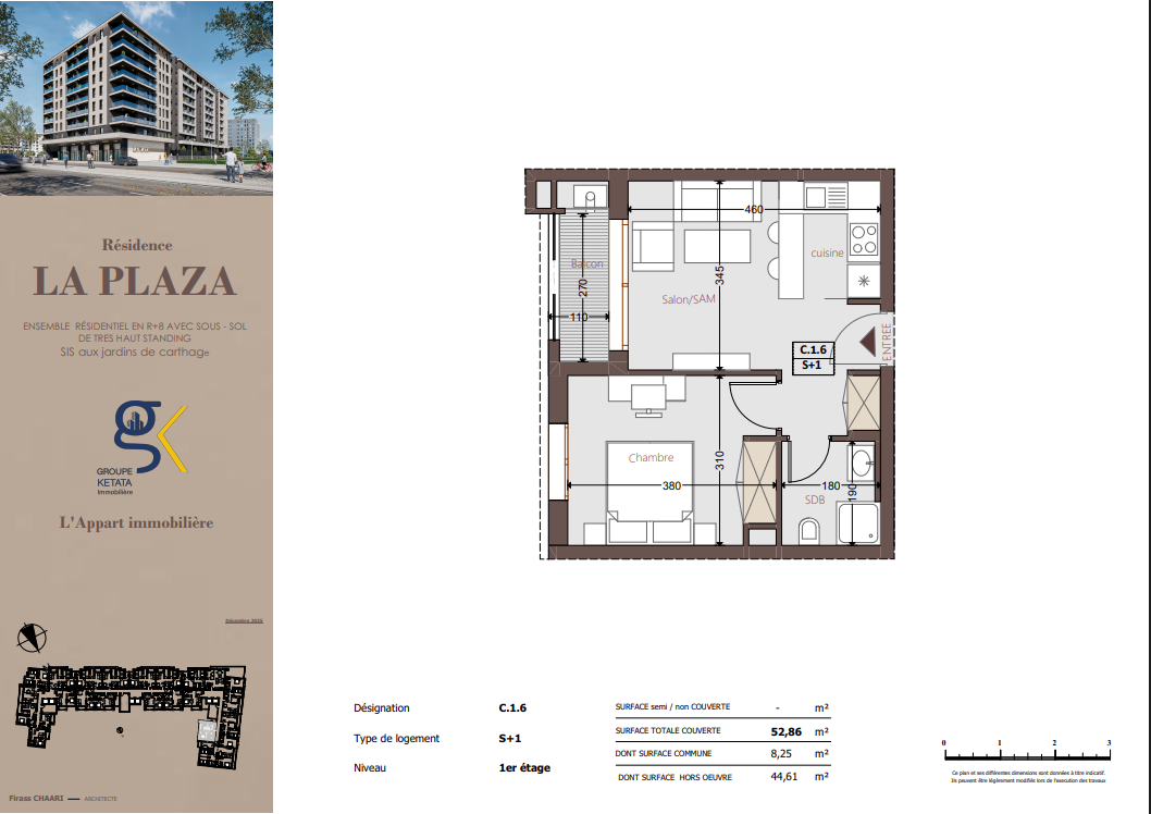 La Plazza se compose de blocs résidentiels harmonieusement pensés, comprenant un sous-sol, un rez-de-chaussée et plusieurs étages, intégrant également des locaux commerciaux. La résidence propose des appartements S+1, S+2 et S+3, conçus selon les standards du très haut standing, offrant des espaces fonctionnels, lumineux et parfaitement optimisés pour répondre à tous les styles de vie.